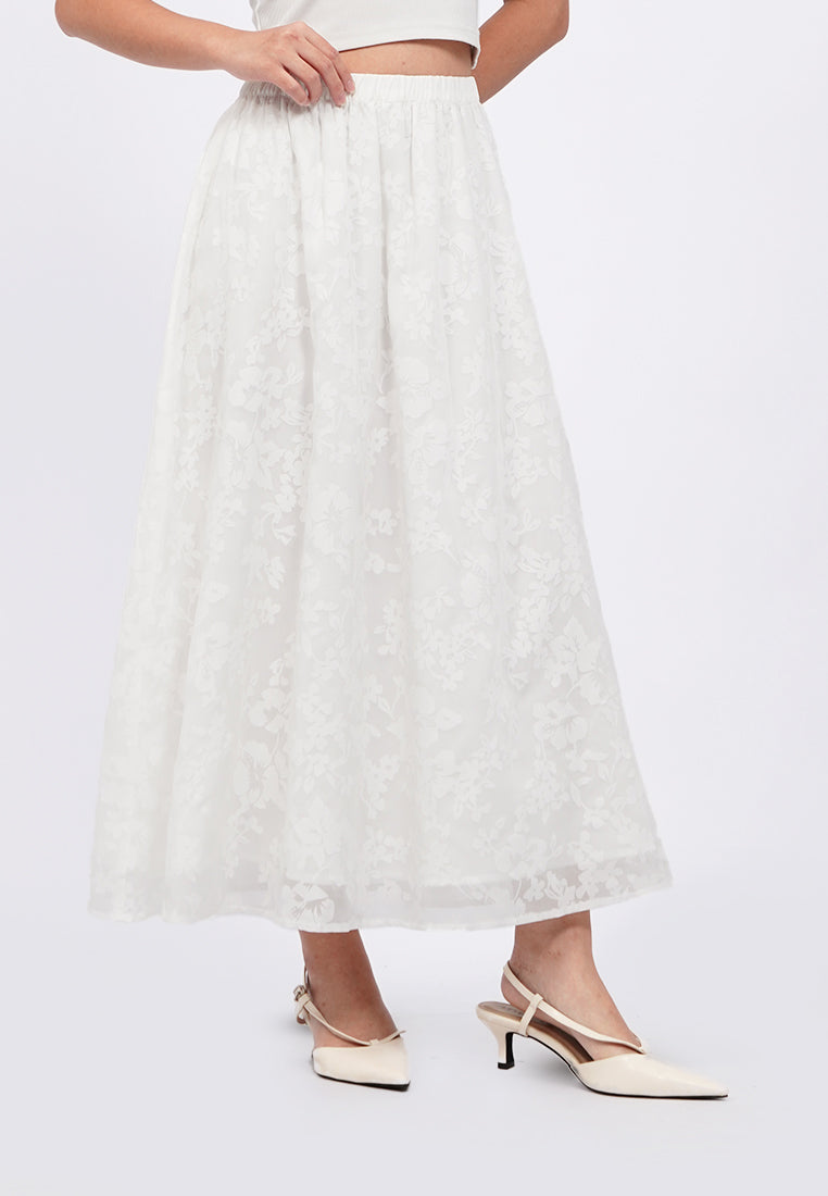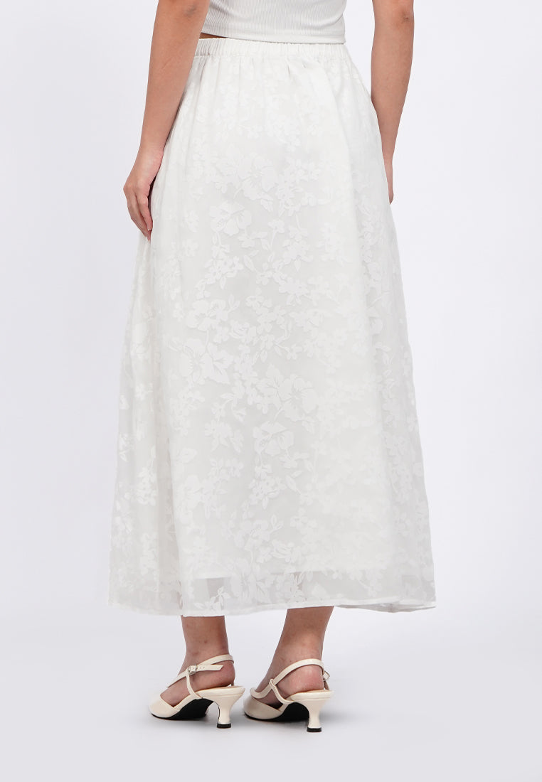 Medium length skirt, Elastic waist, Floral printed sheer fabric, Material: Polyester, Fit: Regular, Color: Off White, Model info: Model Wearing Size S, Height: 168cm, Bust: 74cm, Waist: 62cm, Hips: 86cm