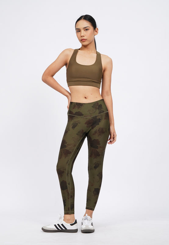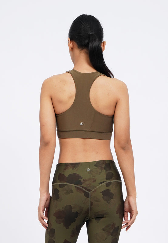 Medium support sports bra, Round neck, Racer back with logo details, Quick dry stretch fabric, Material: Poly Spandex, Fit: Fitted, Color: Olive, Model info: Model Wearing Size S, Height: 165 cm, Bust: 86 cm, Waist: 63 cm, Hips: 78 cm