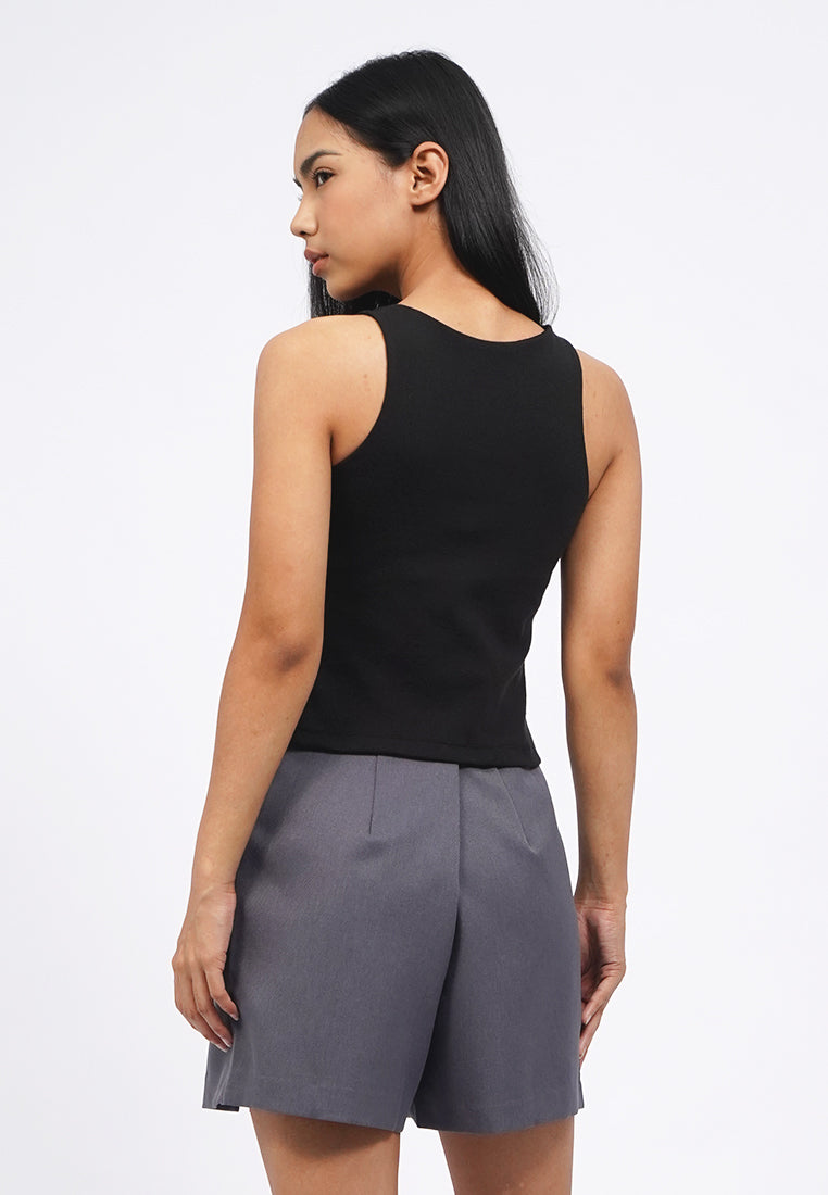 Atasan tanpa lengan, Round neck, Bra pads attached, Textured stretch fabric, Material: Rib TC, Fit: Fitted Crop, Color: Black, Model info: Model Wearing Size S, Height: 165 cm, Bust: 82 cm, Waist: 63 cm, Hips: 83 cm