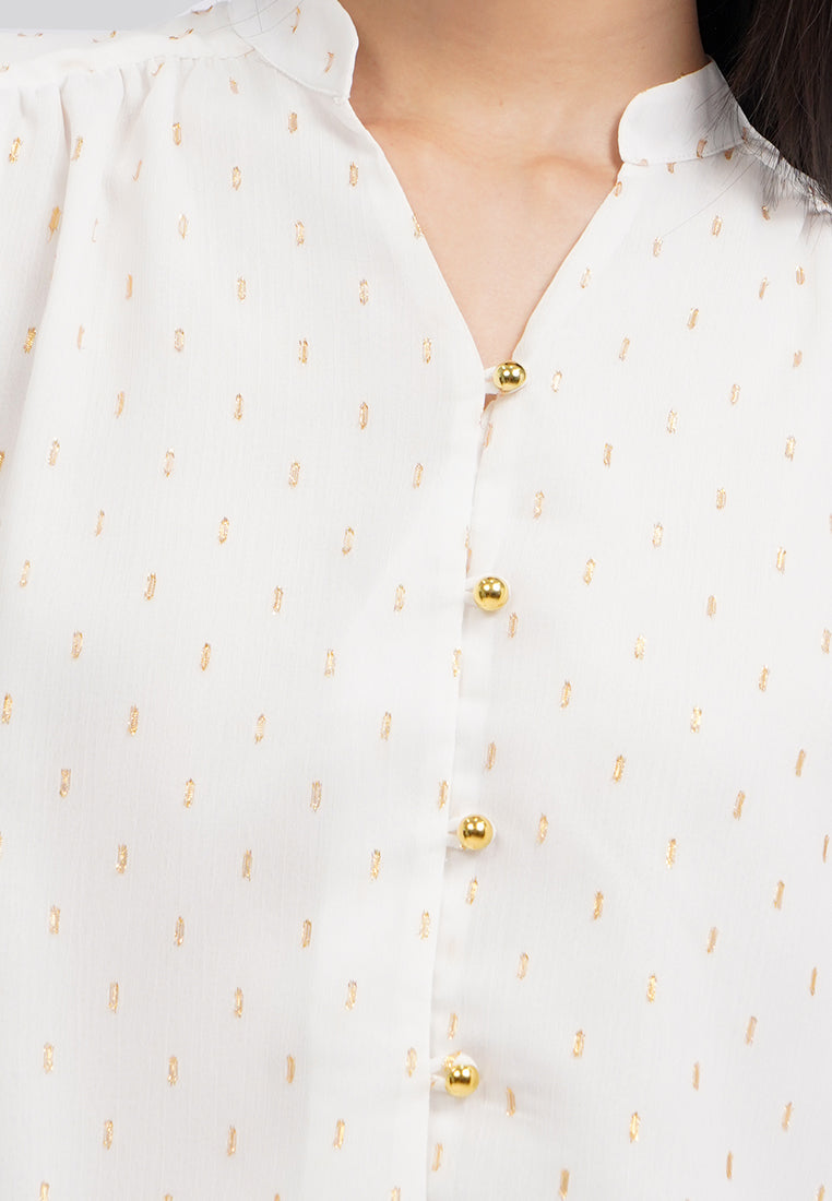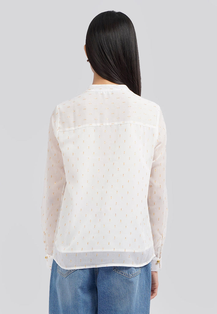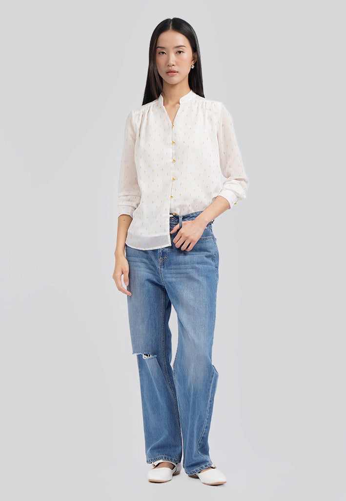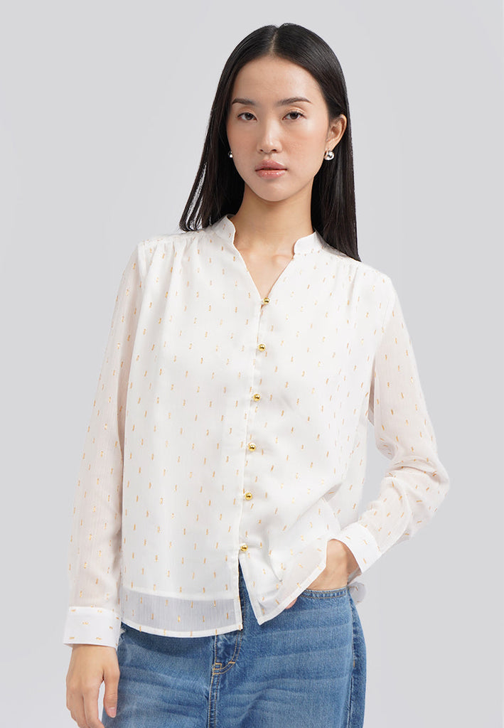 Blouse lengan panjang, V-neck with collar, Dotted mesh fabric, Front button opening, Material: Polyester, Fit: Regular, Color: Off White, Model info: Model Wearing Size S for Top, Size S for Pants, Model Height 170 cm, Bust: 78 cm, Waist: 66 cm, Hips: 84 cm, Art: 5-BLWKSG125B005
