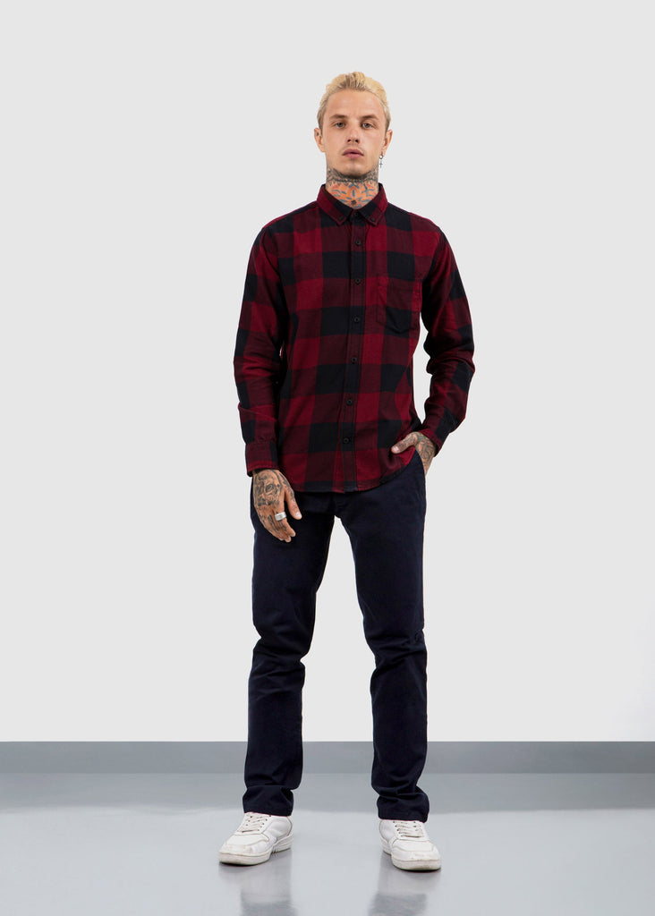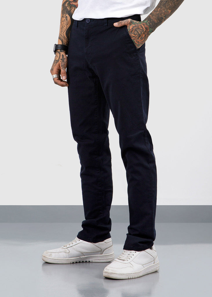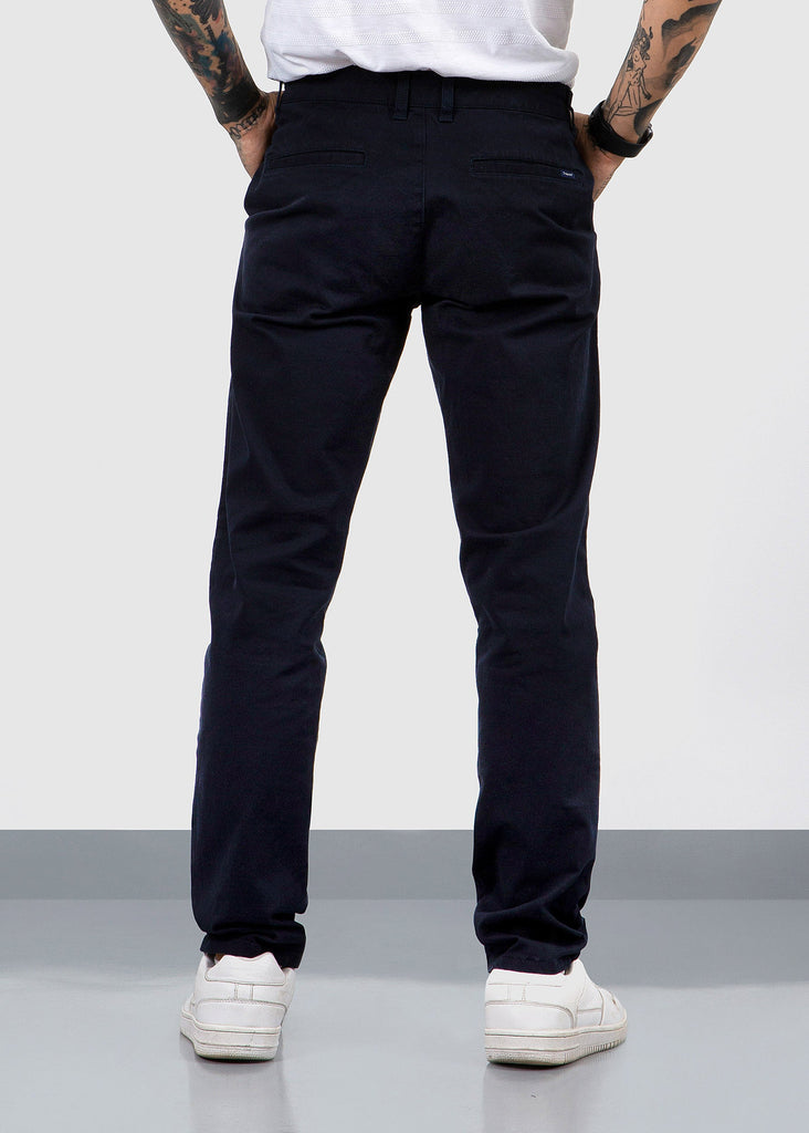 Celana panjang slim fit dengan kostruksi chinos dengan kain elastis dua arah. berkantong di depan dan di belakang. Penutup depan dengan ritsleting dan kancing.