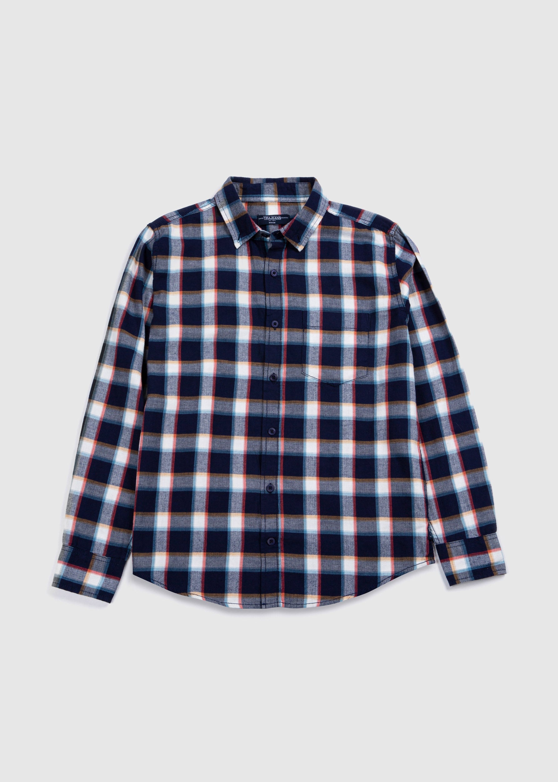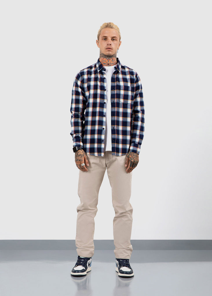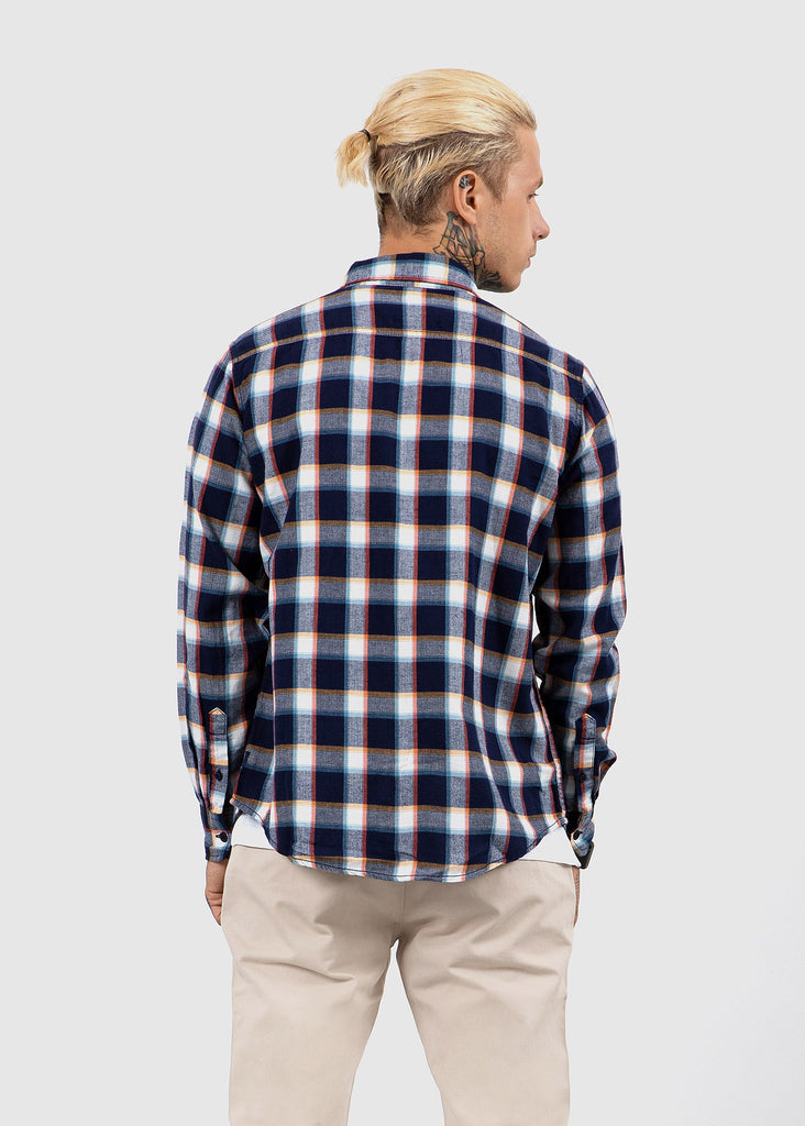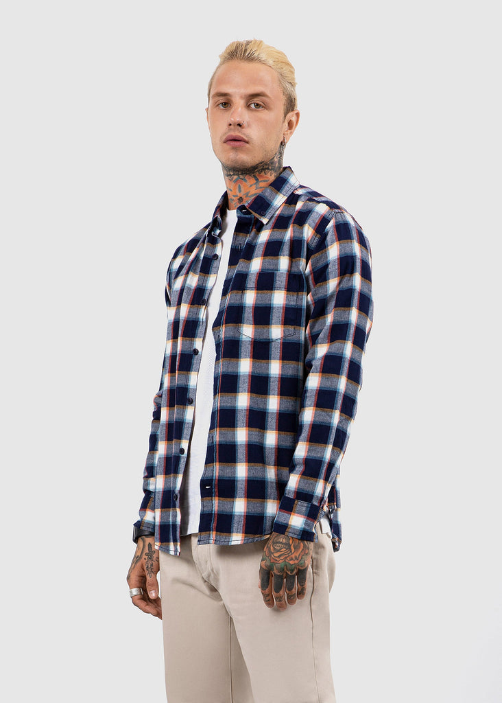Kemeja kotak kotak kerah lapel lengan panjang, memiliki Kantong model tempel di dada dengan manset berkancing di ujung. berbahan flanel katun.