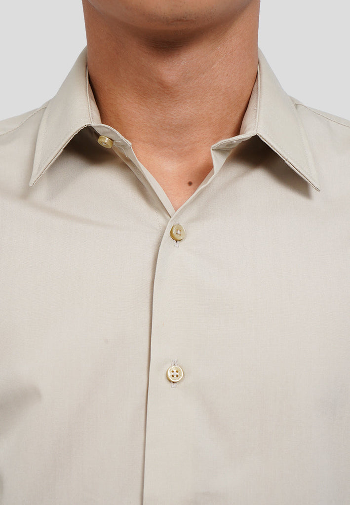 Kemeja lengan panjang, Curved hemline, Easy care fabric, Front button opening, Material: CVC, Fit: Slim, Color: Stone, Model info: Model Wearing Size 16, Model Height 185 cm, Bust: 91 cm, Waist: 80, Hips: 93 cm, Art: 1-LSIBSC525O206