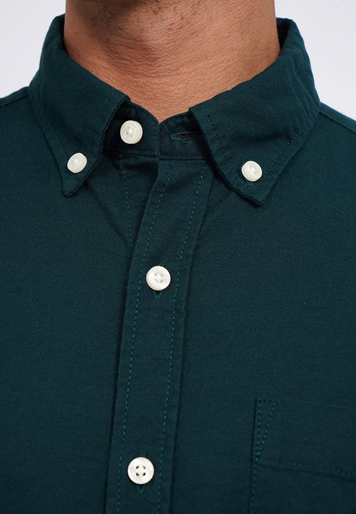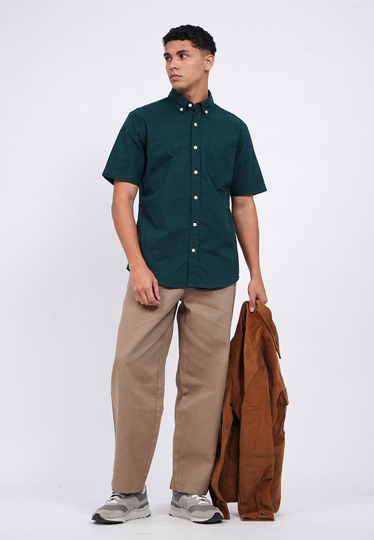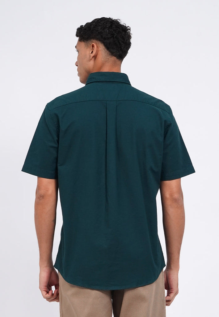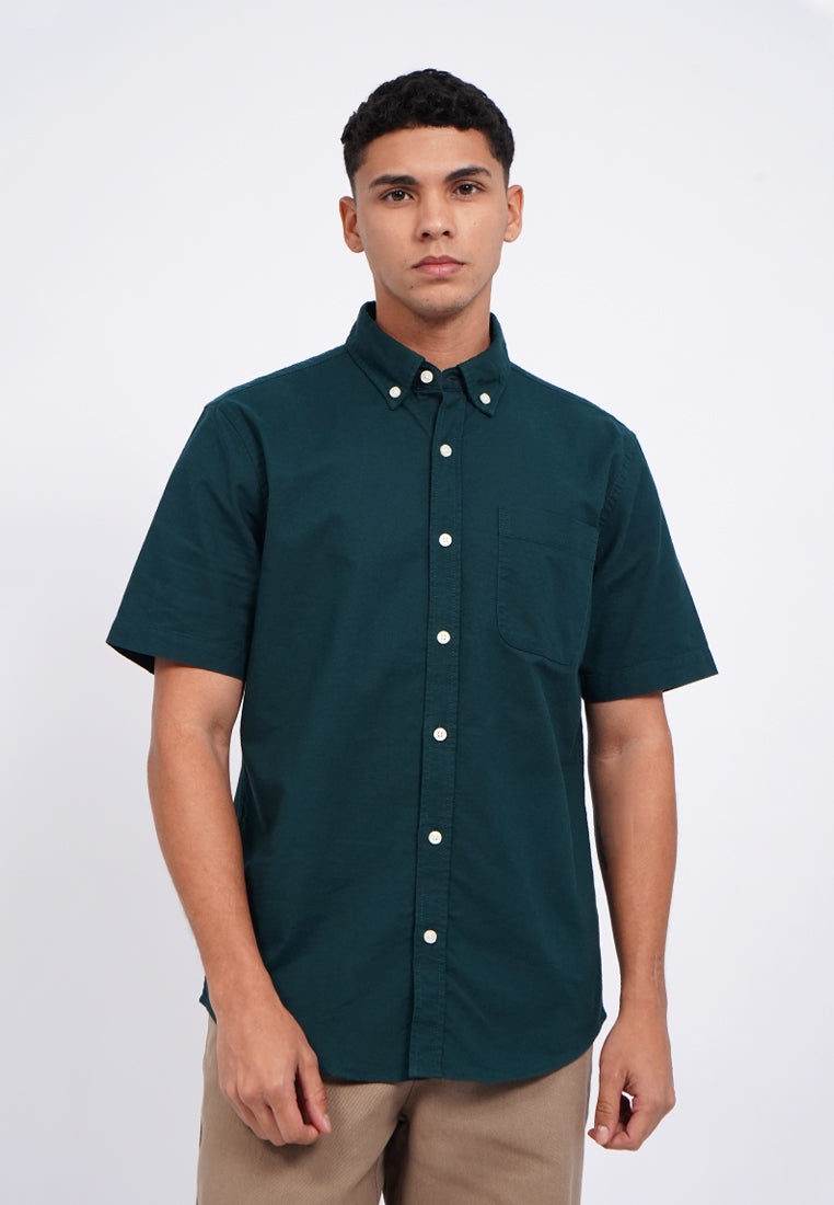 Kemeja lengan pendek, Buttoned down collar, Contrast button details, Rounded front pocket, Material: Cotton, Fit: Regular, Color: Bottle Green, Model info: Model Wearing Size 15.5, Height: 182 cm, Chest: 94 cm, Waist: 75 cm, Hips: 96 cm