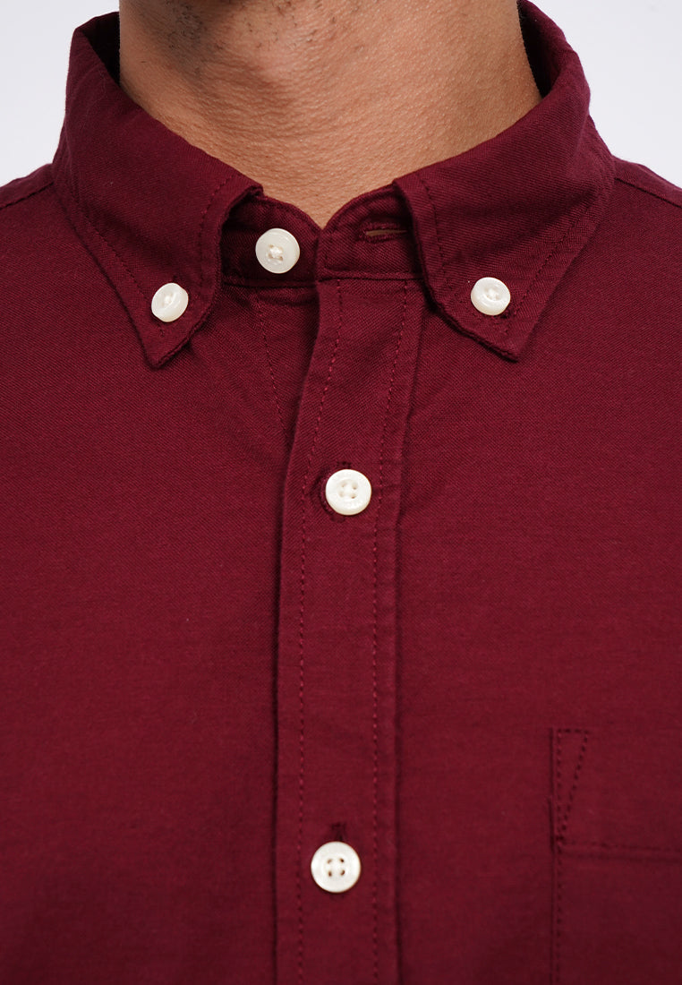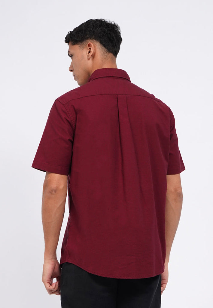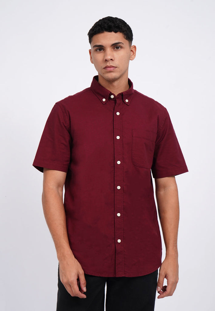 Kemeja lengan pendek, Buttoned down collar, Contrast button details, Rounded front pocket, Material: Cotton, Fit: Regular, Color: Cranberry Red, Model info: Model Wearing Size 15.5, Height: 182 cm, Chest: 94 cm, Waist: 75 cm, Hips: 96 cm