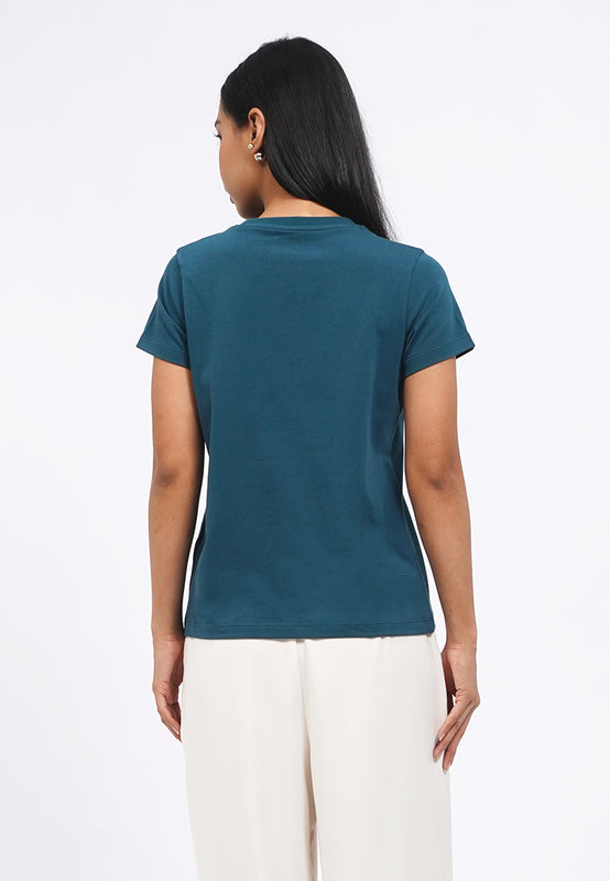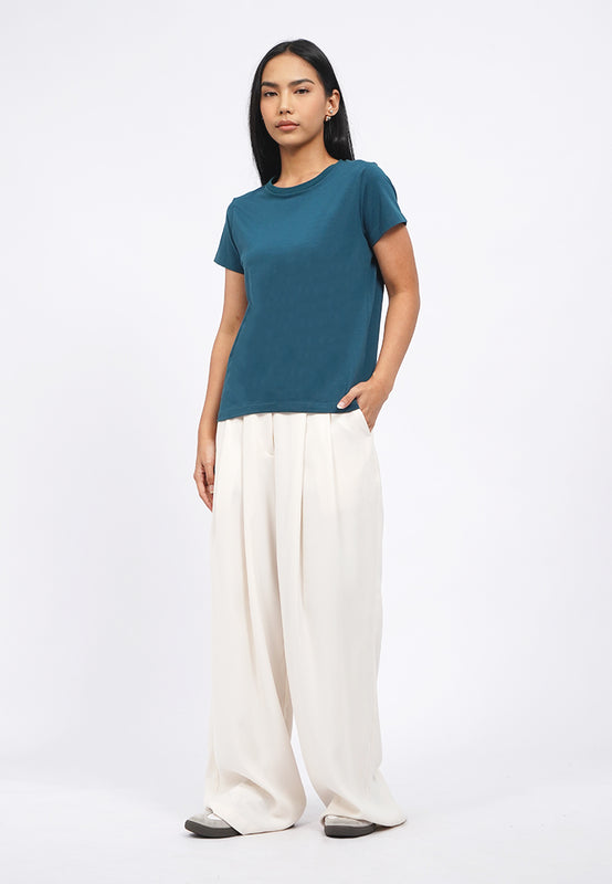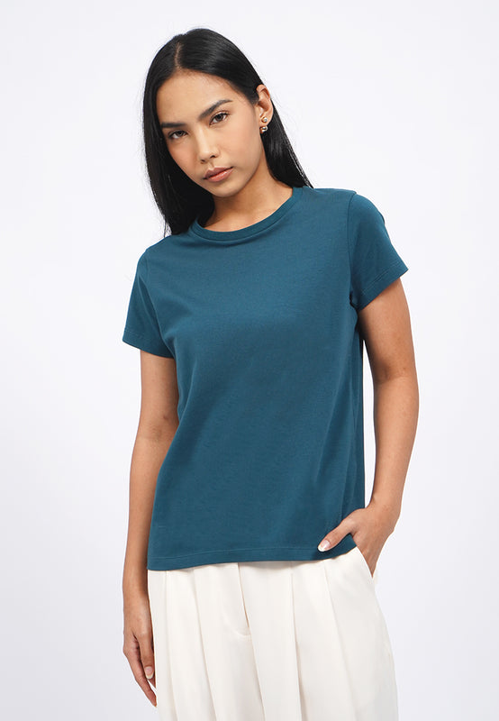 T-shirt basic lengan pendek, Round neck, Regular length, Stretch fabric, Material: Cotton Spandex, Fit: Regular, Color: Teal, Model info: Model Wearing Size S for Top, Size S for Pants, Model Height 165 cm, Bust: 86 cm, Waist: 63 cm, Hips: 78 cm