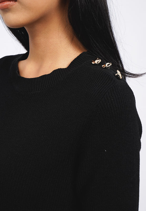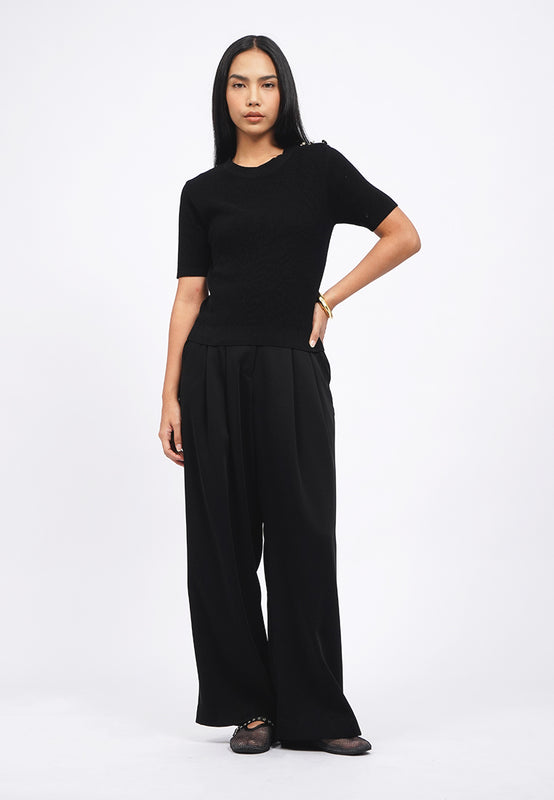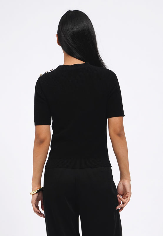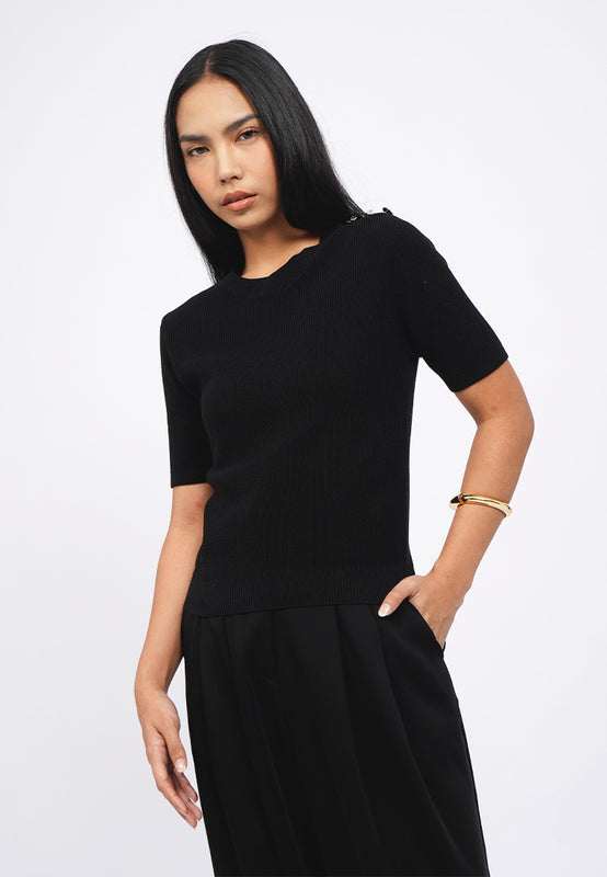 Atasan lengan pendek, Round neck, Gold button details, Textured fabric, Material: Cotton Acrylic, Fit: Slim, Color: Black, Model info: Model Wearing Size S for Top, Size S for Pants, Model Height 165 cm, Bust: 86 cm, Waist: 63 cm, Hips: 78 cm