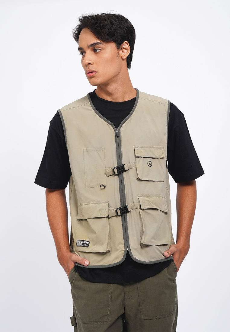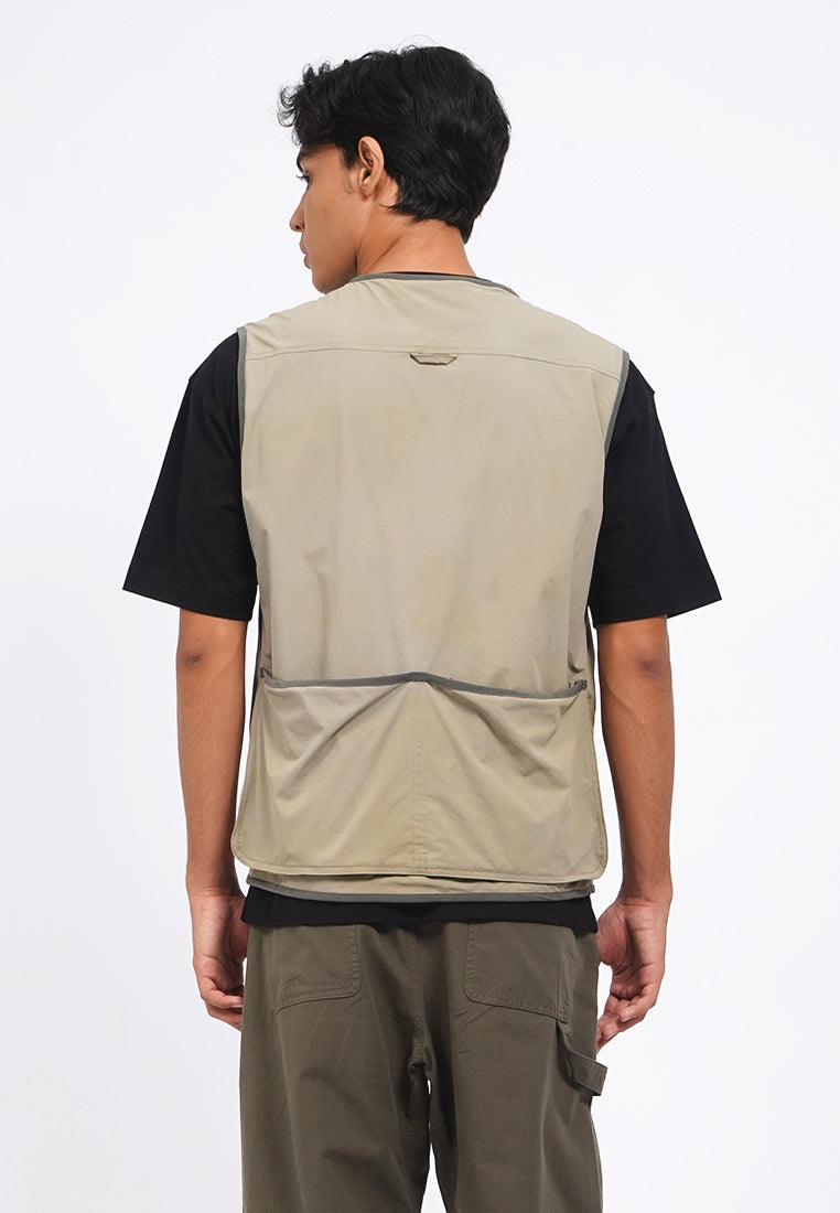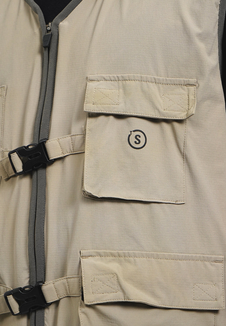 Exclusive collaboration with Common Ground, Atasan tanpa lengan, V-neck, Front zipper with buckle details, Material: Polyester, Fit: Regular, Color: Stone, Model info: Model Wearing Size M, Model Height 185 cm, Bust: 91 cm, Waist: 80, Hips: 93 cm