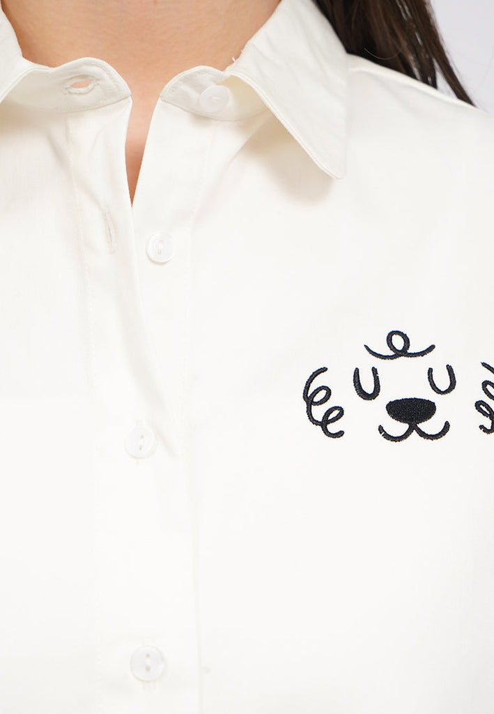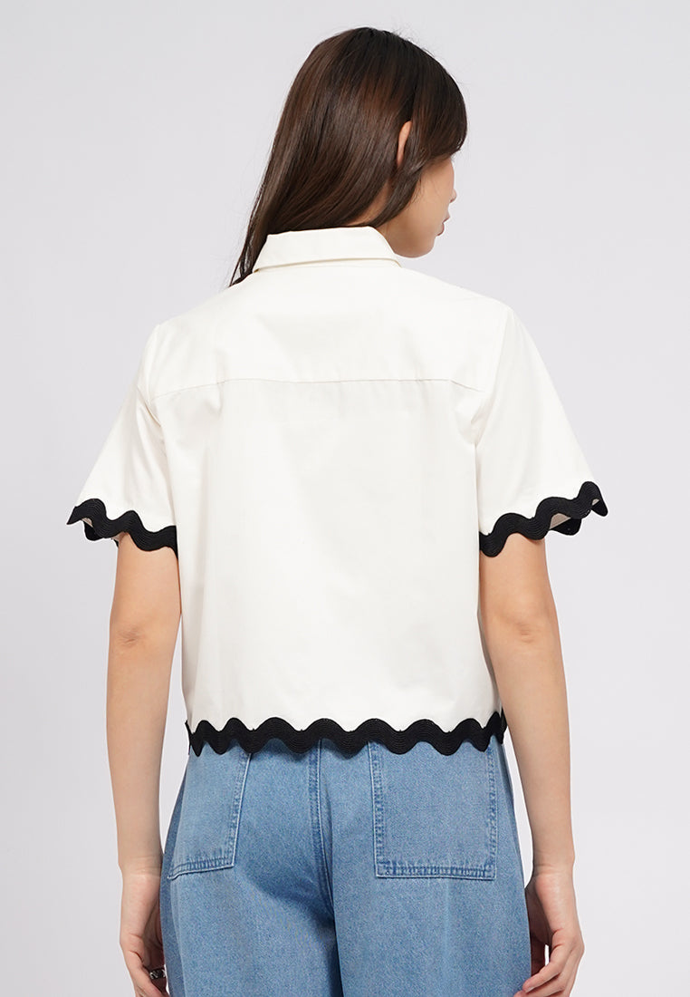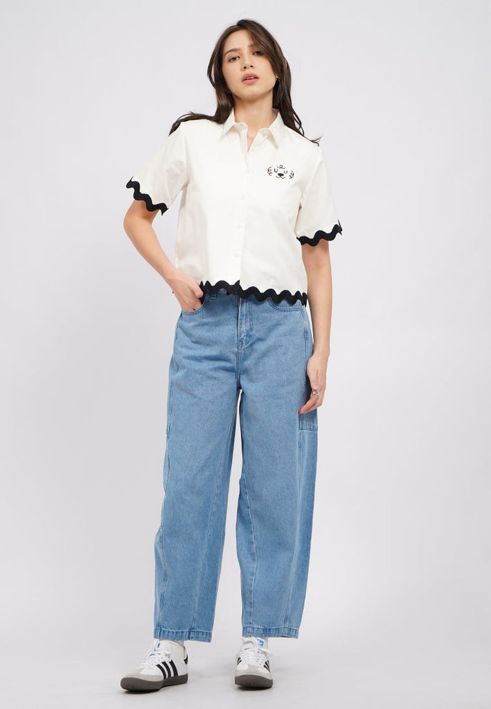 Exclusive collabs with Sanchia, Kemeja lengan pendek, Contrast scallop hem, Embroidery details, Material: Paper Twill, Fit: Boxy, Color: Off White, Model info: Model Wearing Size S, Height: 175cm, Bust: 89, Waist: 69, Hips: 89, Art: 5-BSWCOL325J165