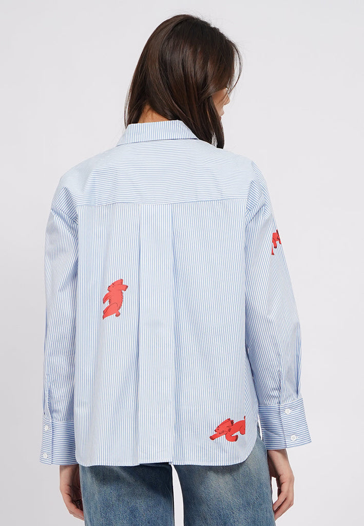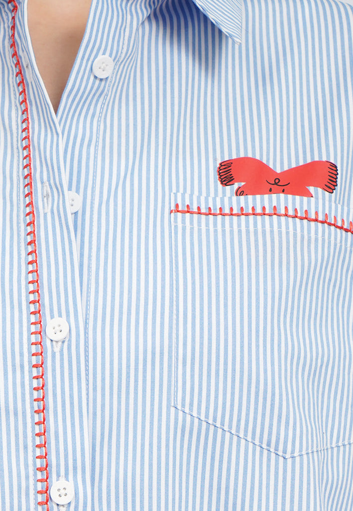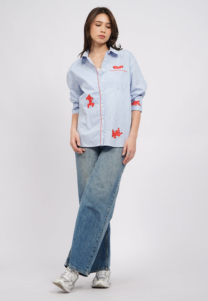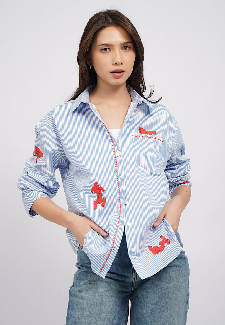 Exclusive collabs with Sanchia, Kemeja lengan panjang, Pointed front pocket, Stripes printed fabric, Material: Cotton, Fit: Oversized, Color: Lt. Blue, Model info: Model Wearing Size S, Height: 175cm, Bust: 89, Waist: 69, Hips: 89, Art: 5-BLWCOL325J163