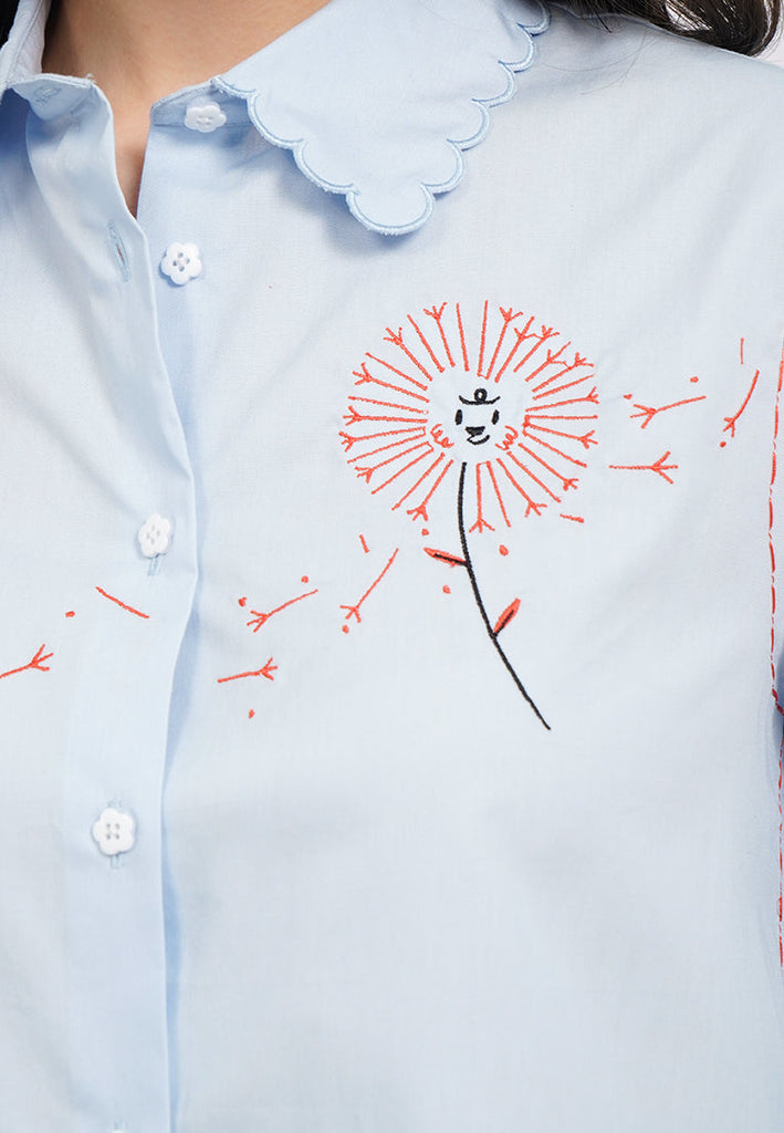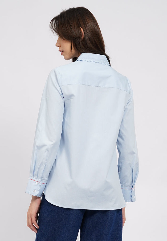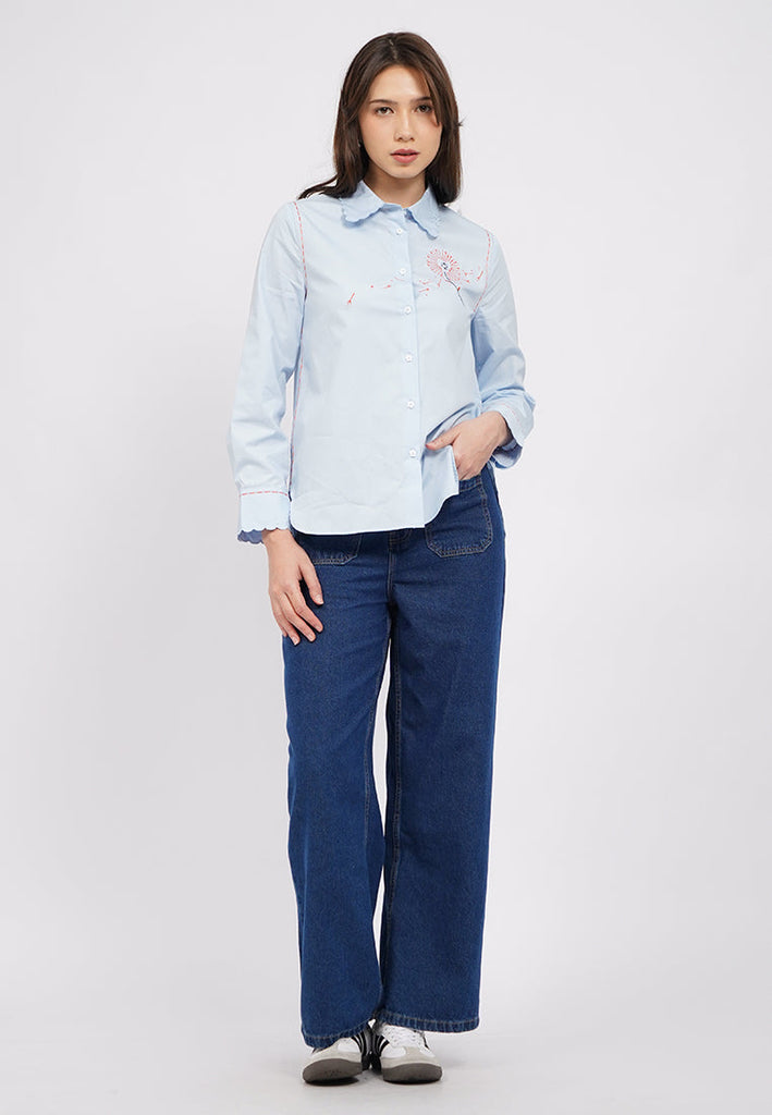 Exclusive collabs with Sanchia, Kemeja lengan panjang, Scallop collar, Contrast embroidery details, Material: Cotton, Fit: Regular, Color: Lt. Blue, Model info: Model Wearing Size S, Height: 175cm, Bust: 89, Waist: 69, Hips: 89, Art: 5-BLWCOL325J161