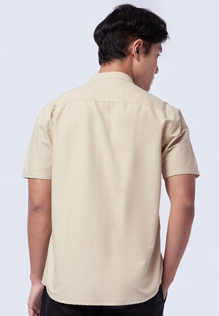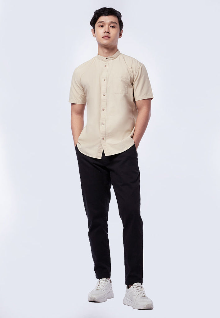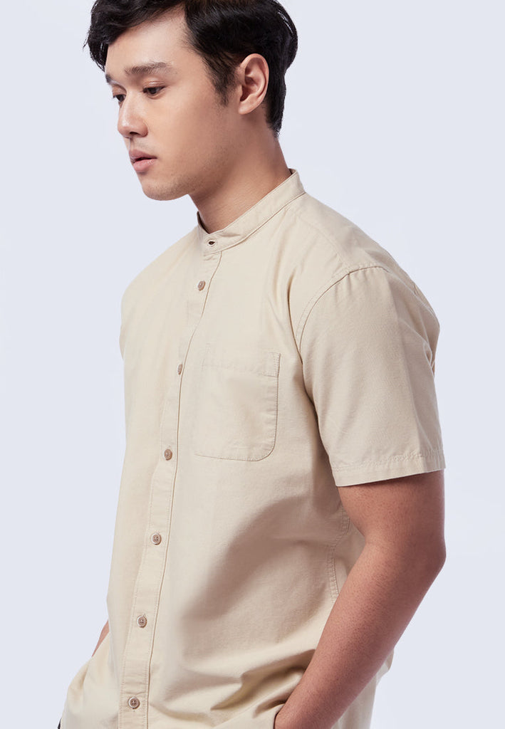 Kemeja lengan pendek, Mandarin collar, Rounded front pocket, Rounded hemline , Material: Cotton , Fit: Regular, Color: Beige, Model info: Model Wearing Size M for Top, Size 32 for Pants, Model Height 183 cm, Bust: 88 cm, Hips: 85 cm, Art: 1-SSRLBF323B109