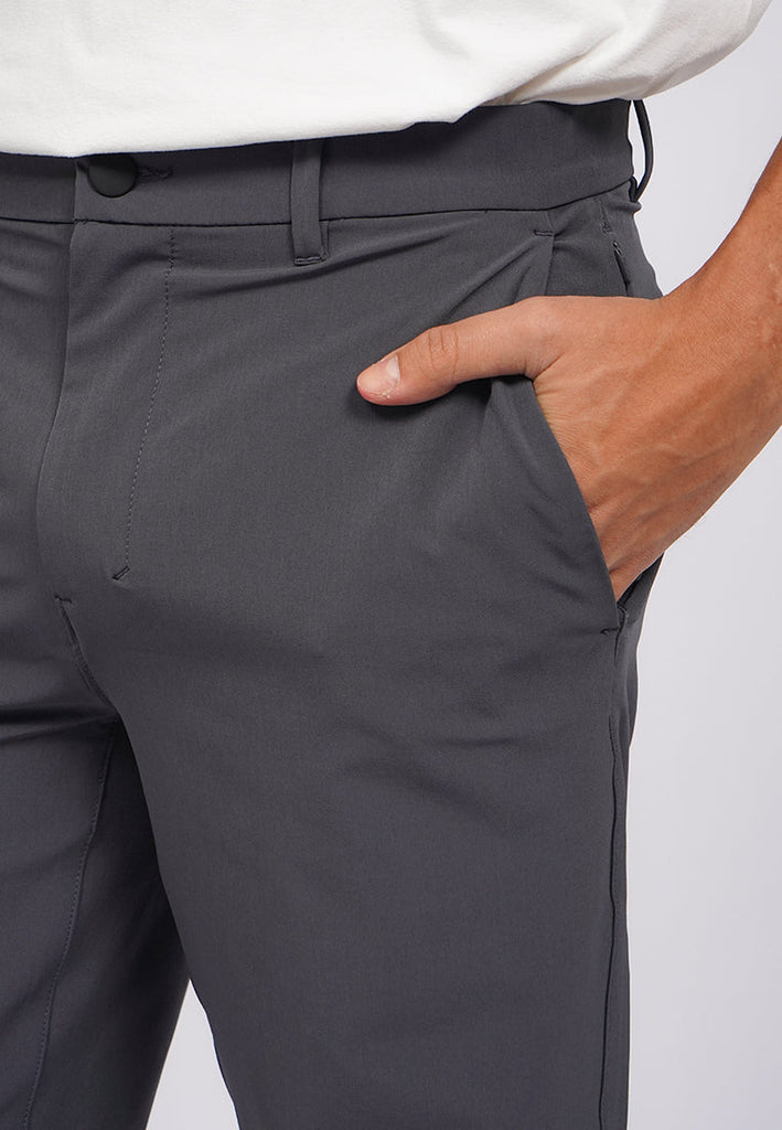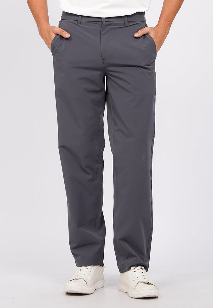 Celana panjang regular fit, Double back pocket, Inseam 29", 4-way stretch fabric, Front zipper with button opening, Material: Poly Spandex, Fit: Regular, Color: Graphite Grey, Model info: Model Wearing Size 31_29, Height: 182, Chest: 94, Waist: 75, Hips: 96, Art: 1-LPRACT225J110