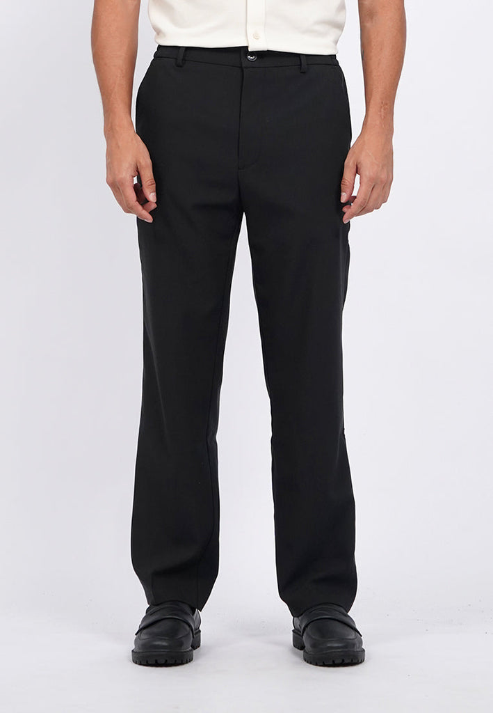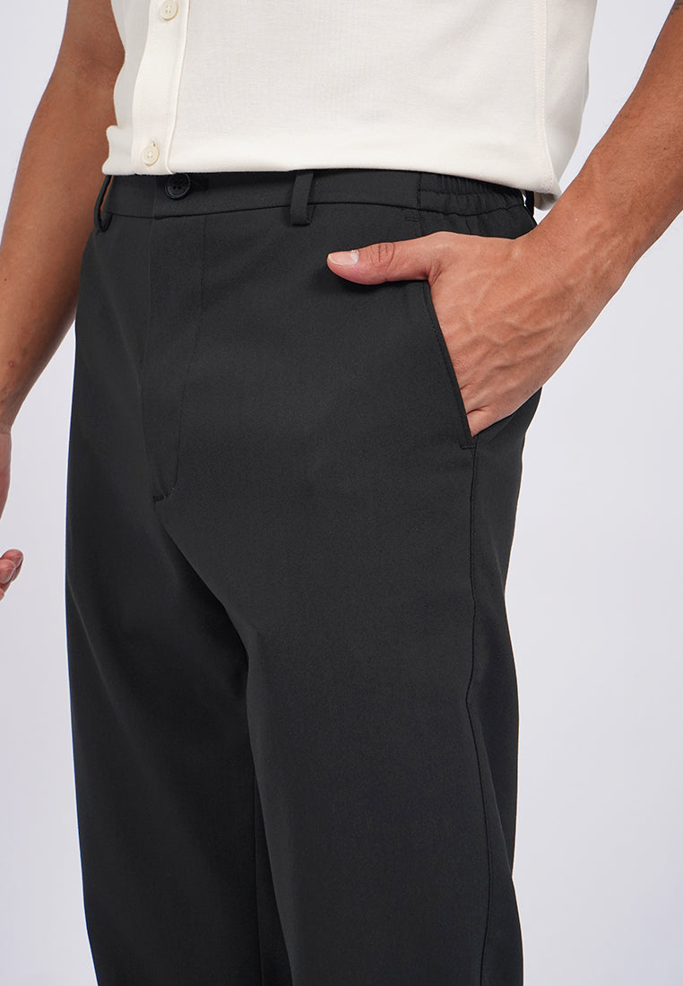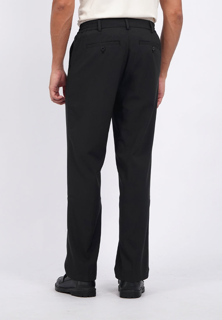 Celana panjang regular fit, Double buttoned back pocket, Side elastic waist details, Material: Polyester, Fit: Regular, Color: Black, Model info: Model Wearing Size M, Height: 182 cm, Chest: 94 cm, Waist: 75 cm, Hips: 96 cm