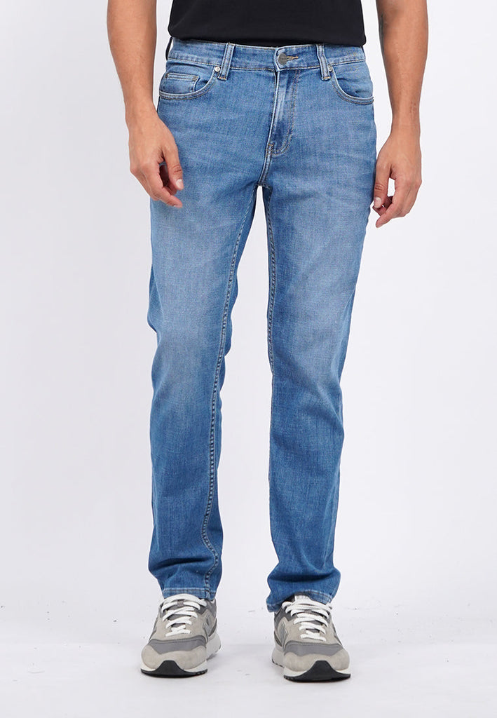 Celana jeans denim fitting slim tapered berbahan crosshatch denim, denim dengan tekstur crosshatch, dengan washingan light blue, dengan effect whisker dan spray yang subtle hingga jeans terlihat worn in. Memiliki lima kantung. Ritsleting depan dengan kancing logam. Berbahan cotton elastan yang adem dan nyaman untuk beraktivitas., Material: Cotton Elastan, Fit: Slim, Color: Lt. Blue, Model info: Model Wearing Size 31, Model Height: 182, Waist: 75, Bust: 94, Hips: 96