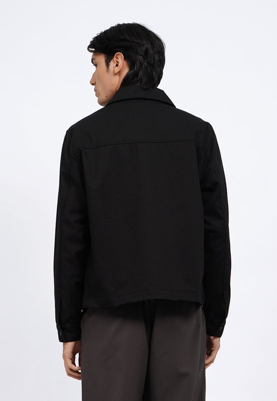 Boxy fit jacket, Shirt collar, Contrast front zipper opening, Crop length, Material: Poly Viscose, Fit: Regular, Color: Black, Model info: Model Wearing Size M, Height 183.5cm, Bust: 86 cm, Waist: 72, Hips: 82 cm