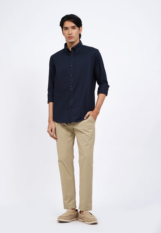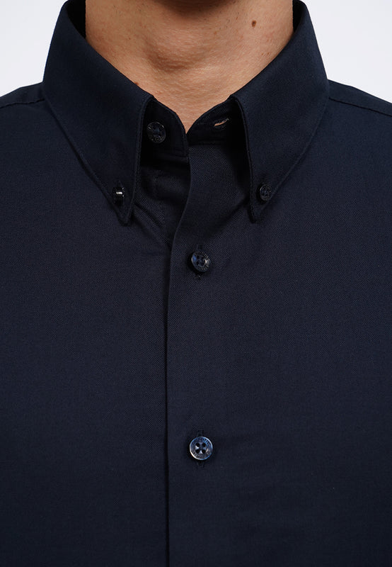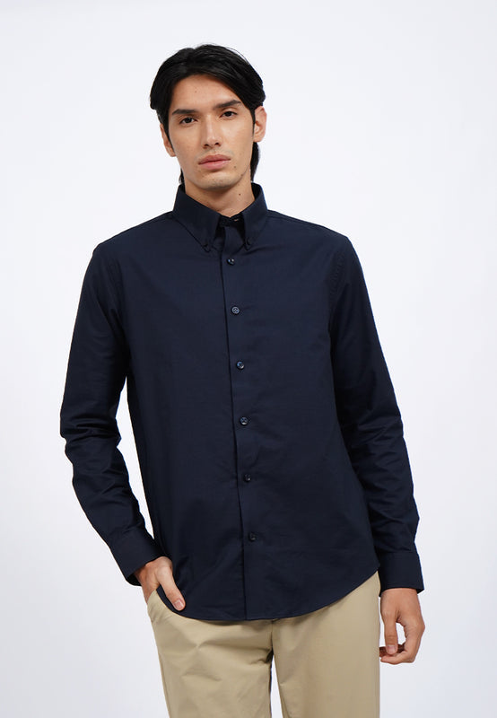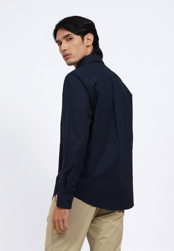Kemeja lengan panjang, Buttoned down collar, Curved hemline, Front button opening, Material: Cotton, Fit: Regular, Color: Navy, Model info: Model Wearing Size 15.5, Height 183.5cm, Bust: 86 cm, Waist: 72, Hips: 82 cm