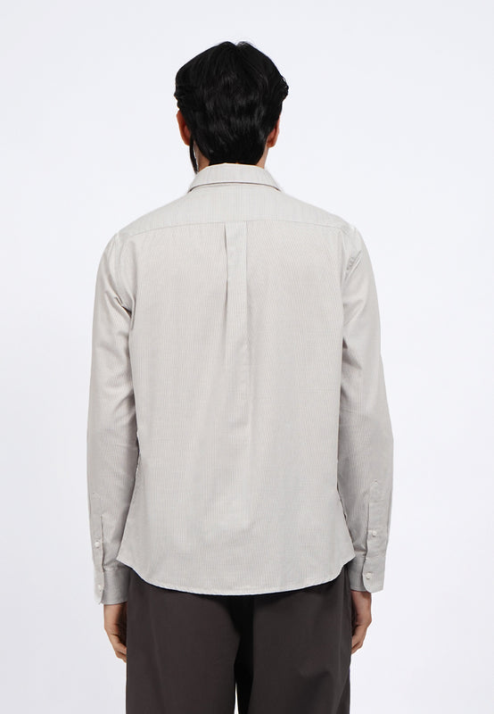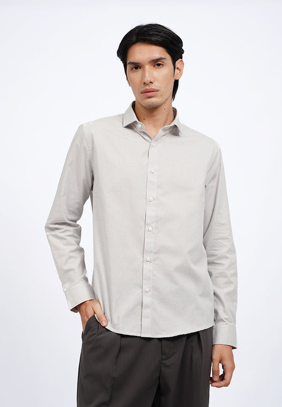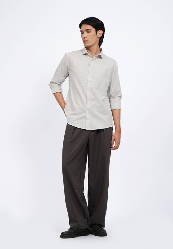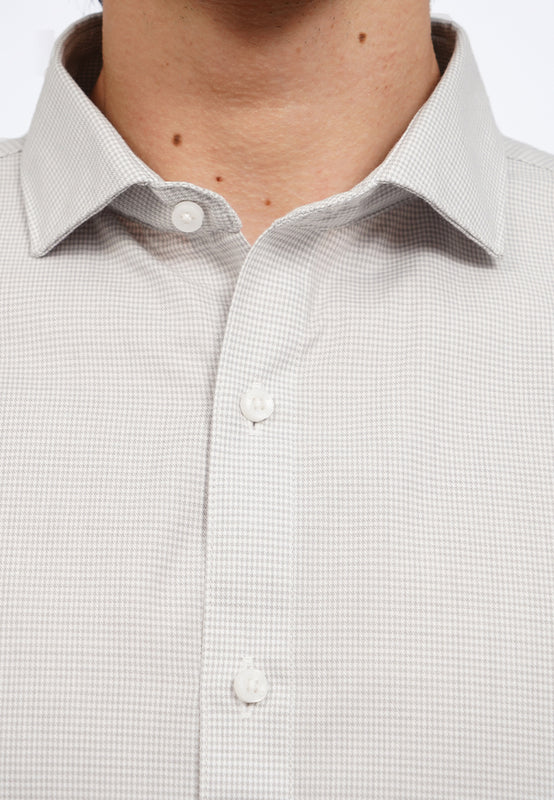 Kemeja lengan panjang, Houndstooth printed fabric, Back pleat details, Front button opening, Material: CVC, Fit: Regular, Color: Grey, Model info: Model Wearing Size 15.5, Height 183.5cm, Bust: 86 cm, Waist: 72, Hips: 82 cm
