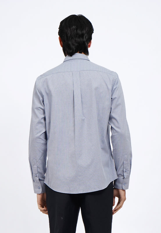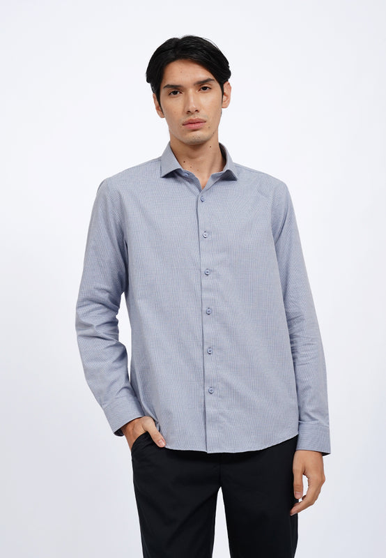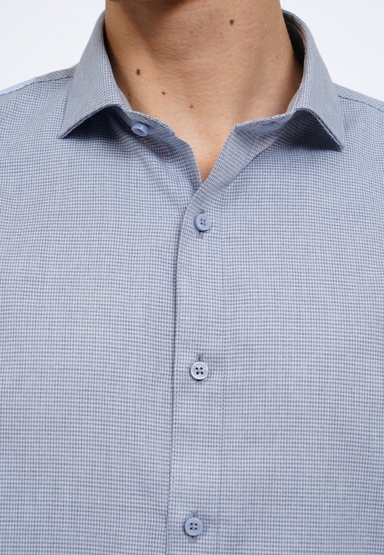Kemeja lengan panjang, Houndstooth printed fabric, Back pleat details, Front button opening, Material: CVC, Fit: Regular, Color: Blue, Model info: Model Wearing Size 15.5, Height 183.5cm, Bust: 86 cm, Waist: 72, Hips: 82 cm