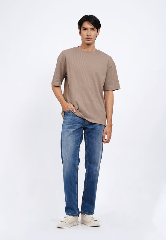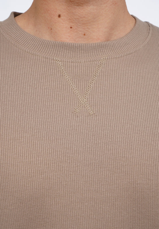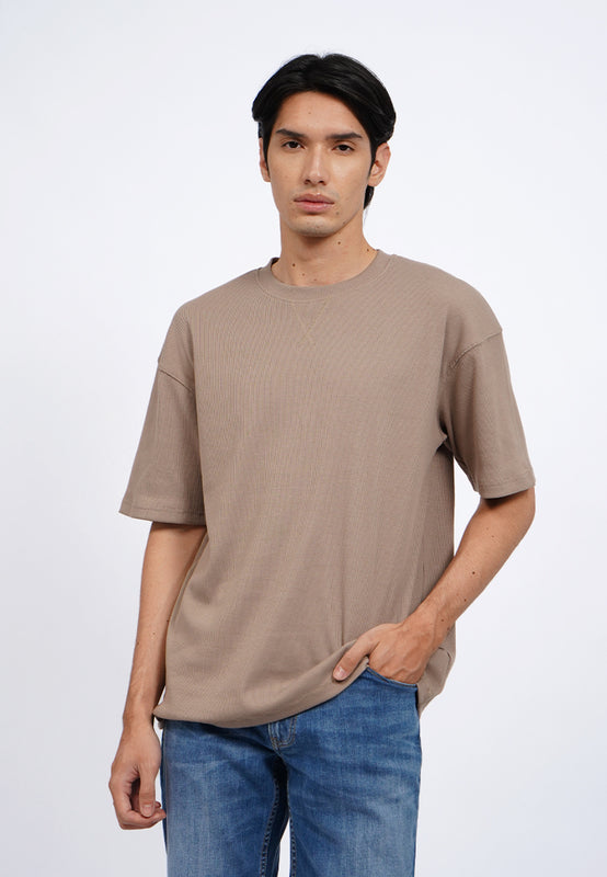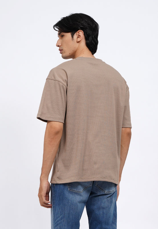 T-shirt lengan pendek, Round neck, Drop shoulder details, Textured fabric, Material: Cotton, Fit: Oversized, Color: Taupe, Model info: Model Wearing Size M, Height 183.5cm, Bust: 86 cm, Waist: 72, Hips: 82 cm