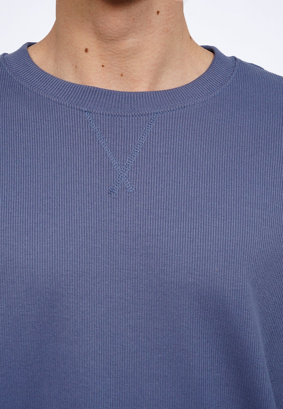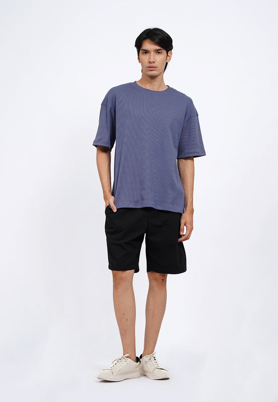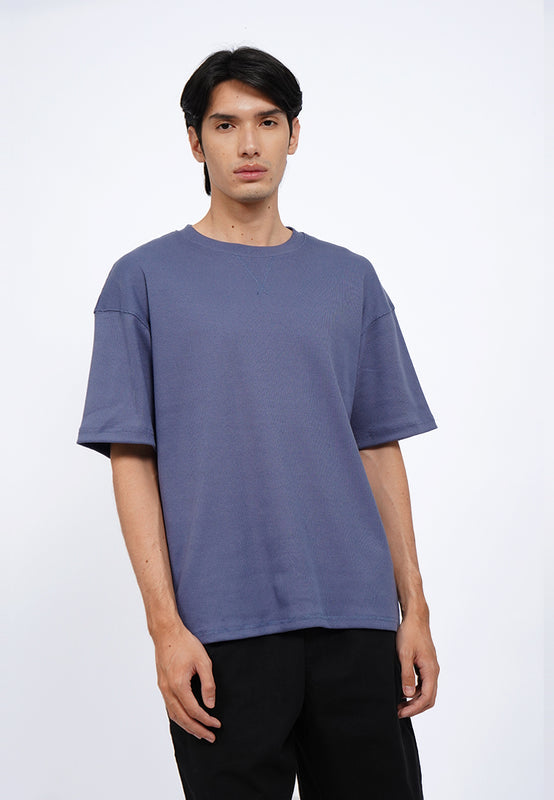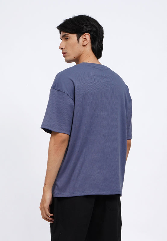 T-shirt lengan pendek, Round neck, Drop shoulder details, Textured fabric, Material: Cotton, Fit: Oversized, Color: Indigo, Model info: Model Wearing Size M, Height 183.5cm, Bust: 86 cm, Waist: 72, Hips: 82 cm