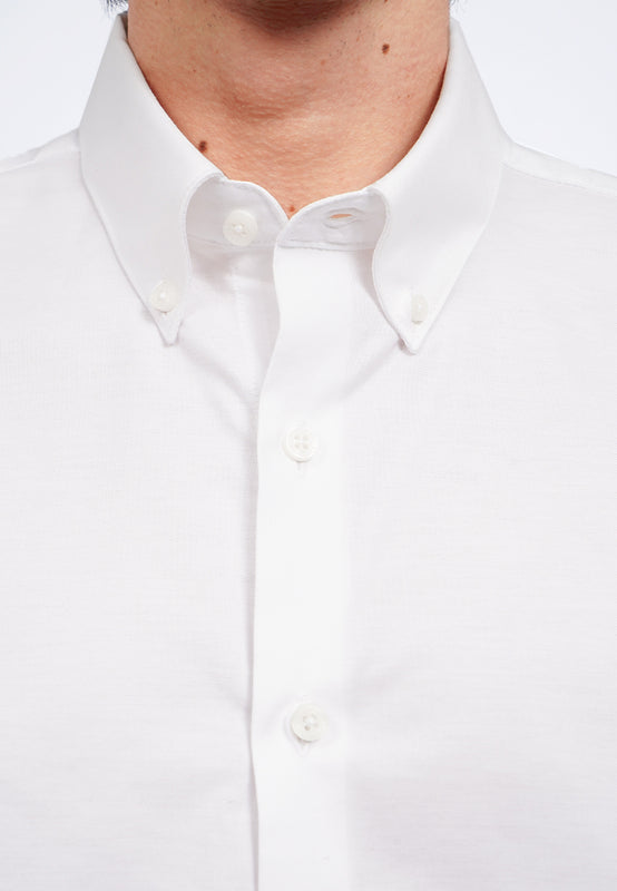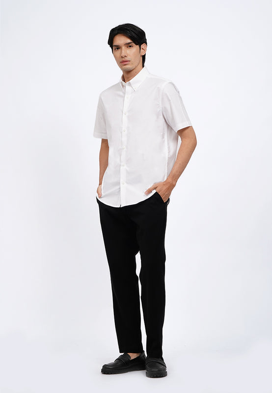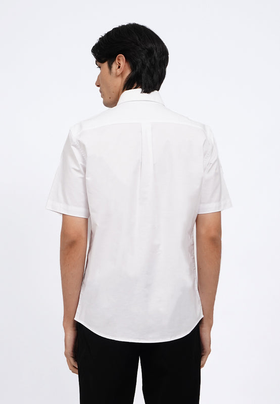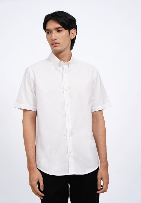 Kemeja lengan pendek, Buttoned down collar, Curved hemline, Front button opening, Material: CVC, Fit: Regular, Color: White, Model info: Model Wearing Size 15.5, Height 183.5cm, Bust: 86 cm, Waist: 72, Hips: 82 cm