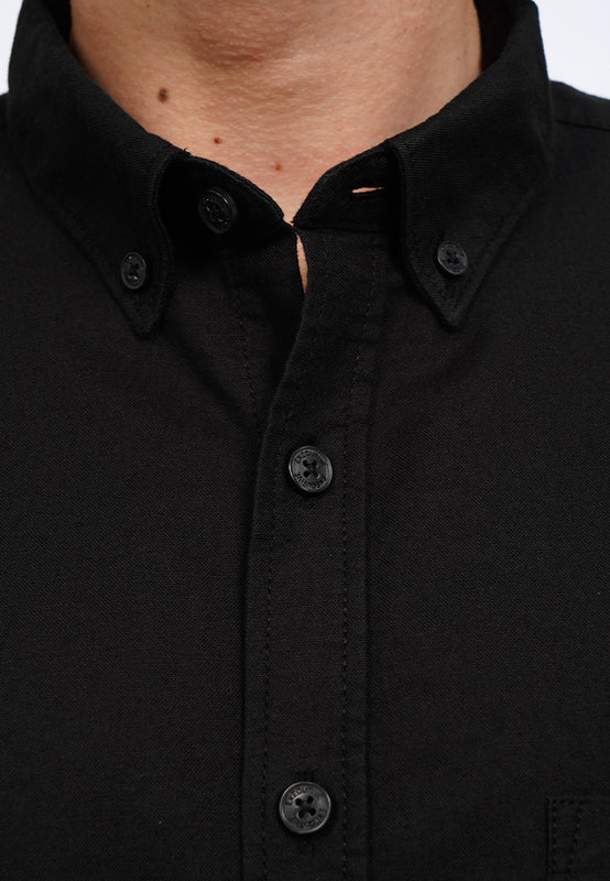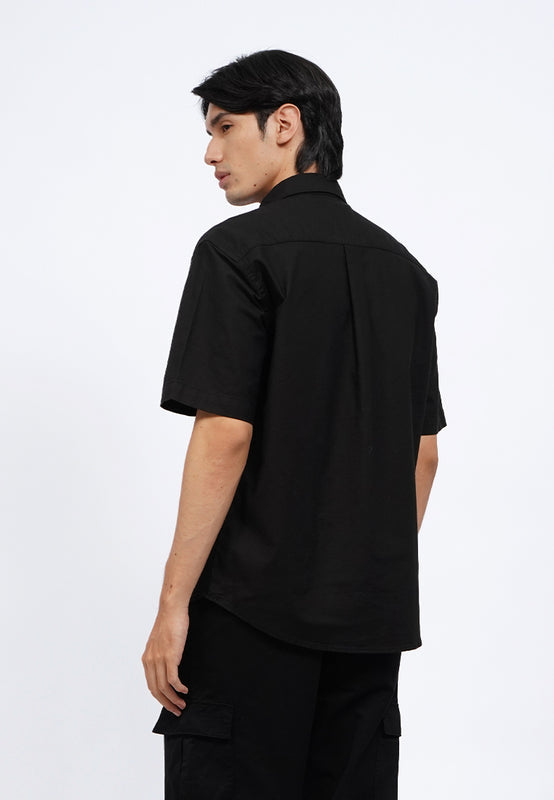 Kemeja lengan pendek, Buttoned down collar, Relaxed fit, Pointed front button opening, Material: Cotton Oxford, Fit: Relaxed Fit, Color: Black, Model info: Model Wearing Size 15.5, Height 183.5cm, Bust: 86 cm, Waist: 72, Hips: 82 cm