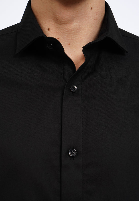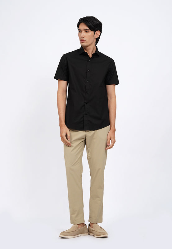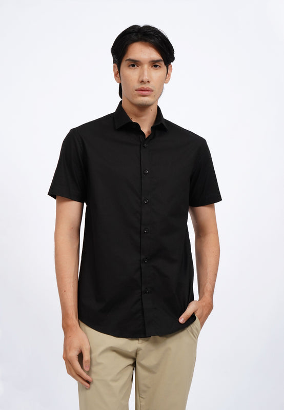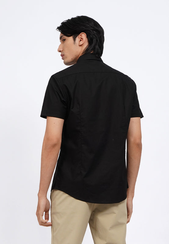 Kemeja lengan pendek, Textured stretch fabric, Front button opening, Material: CVC Twill, Fit: Slim, Color: Black, Model info: Model Wearing Size 15.5, Height 183.5cm, Bust: 86 cm, Waist: 72, Hips: 82 cm
