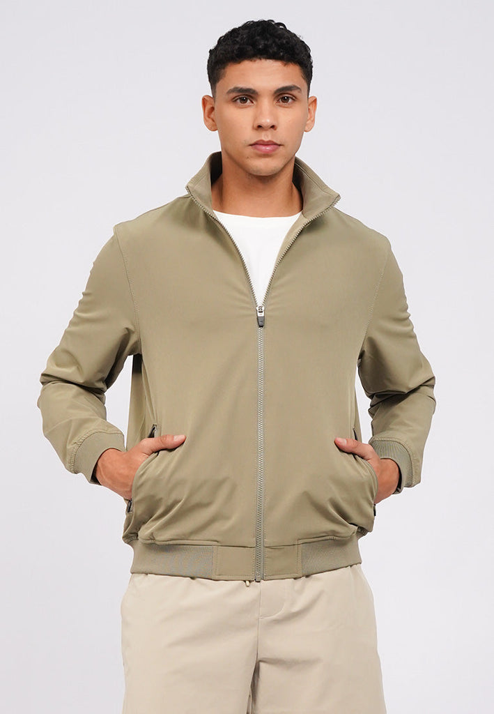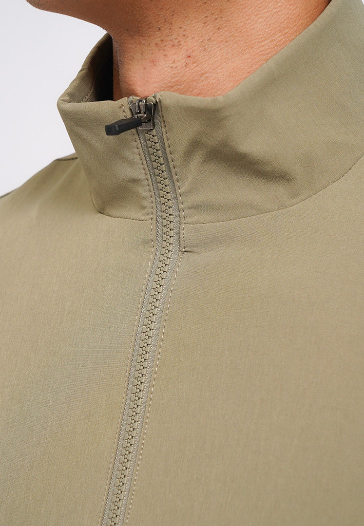 Long sleeve active jacket, 4-way stretch fabric, High collar, Full zip opening, Side pocket with zipper details, Material: Poly Spandex, Fit: Slim, Color: Moss Green, Model info: Model Wearing Size M, Height: 182, Chest: 94, Waist: 75, Hips: 96, Art: 1-JKIACT225J104