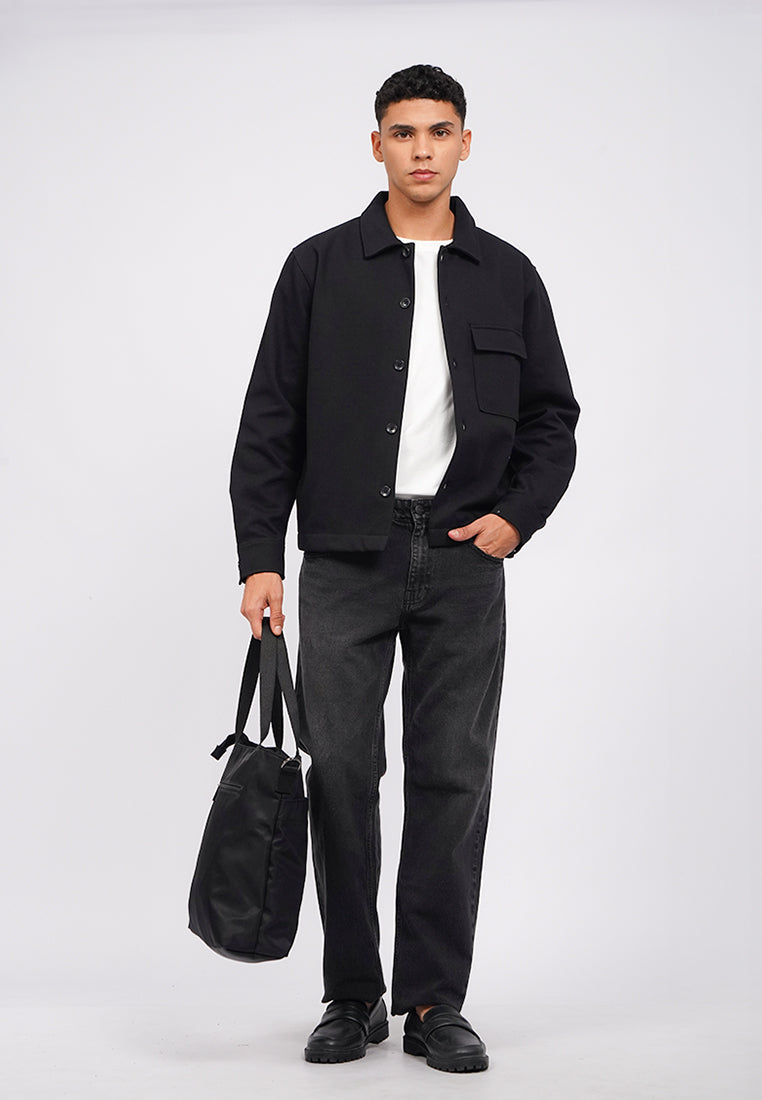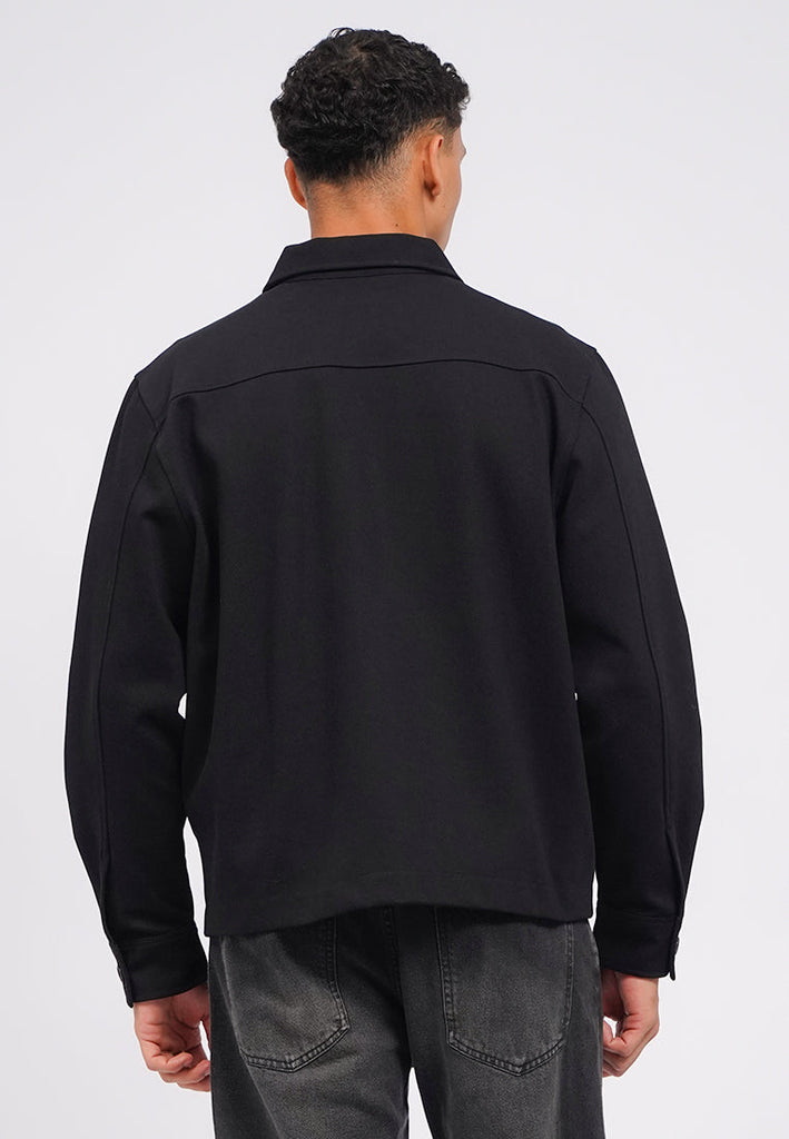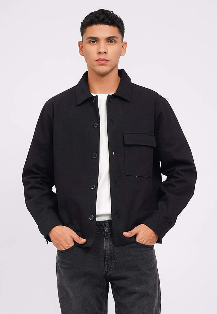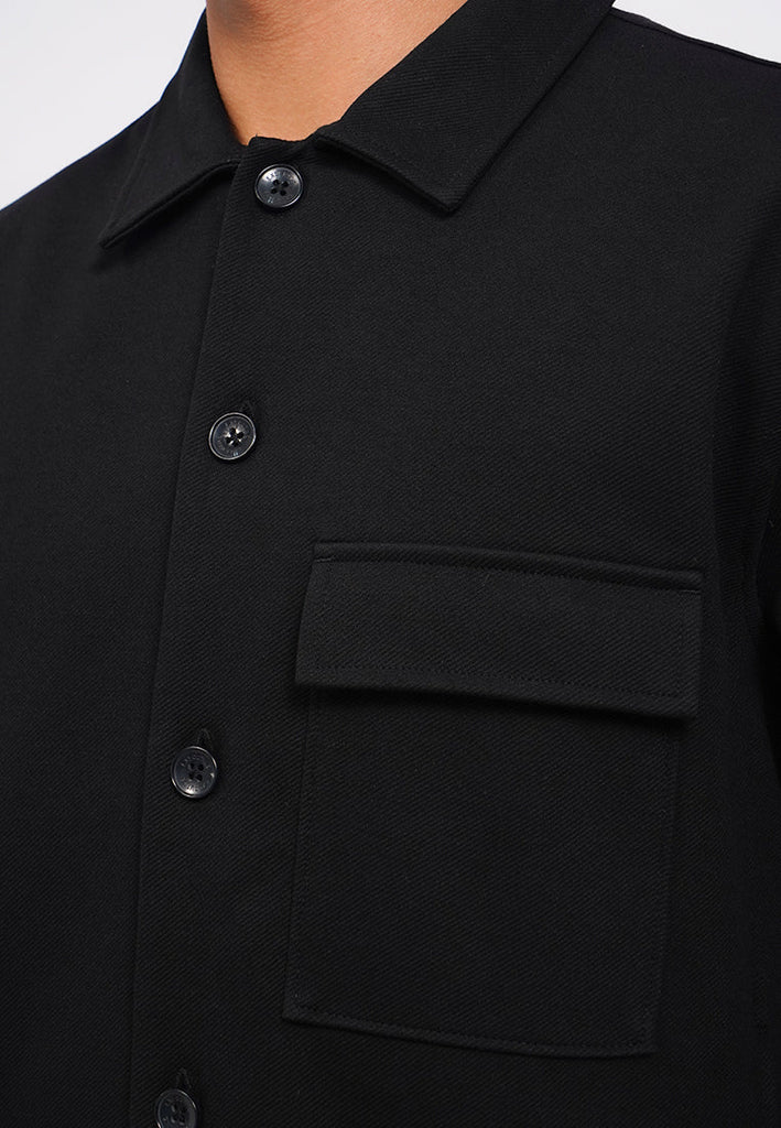 Jaket lengan panjang, Kerah kemeja, Double flap pocket with button, Front snap button opening, Material: CVC Knit, Fit: Regular, Color: Black, Model info: Model Wearing Size M, Height: 182, Chest: 94, Waist: 75, Hips: 96, Art: 1-JKRCRO225K234