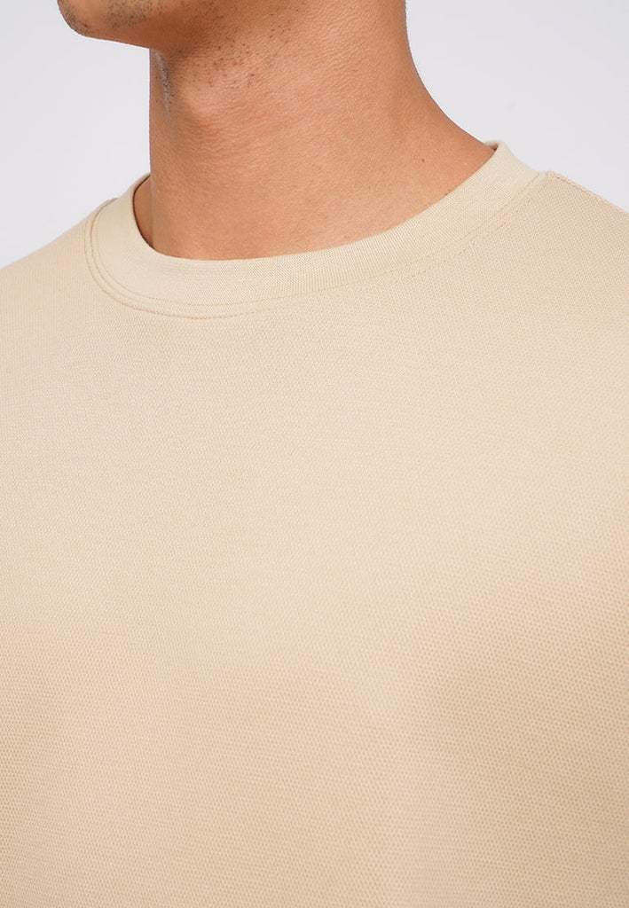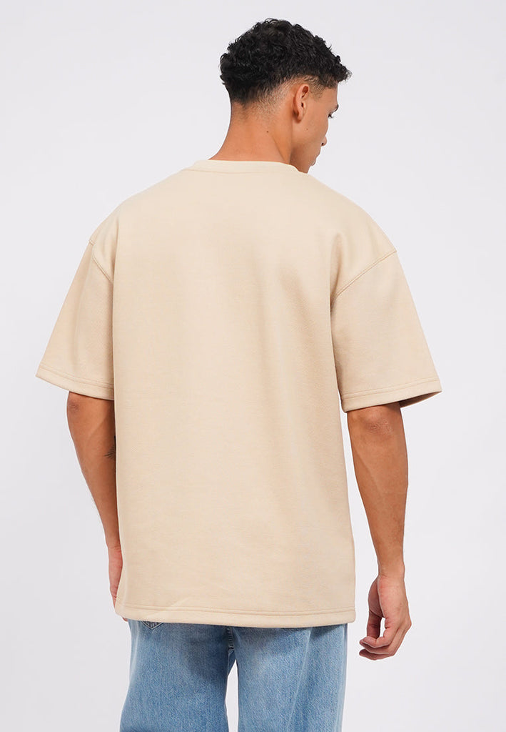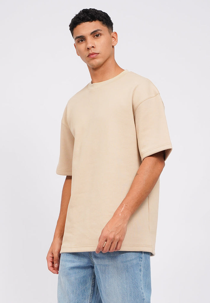 T-shirt lengan pendek, Round neck, Drop shoulder details, Textured fabric, Material: CVC Double Knit, Fit: Oversized, Color: Oat, Model info: Model Wearing Size M, Height: 182, Chest: 94, Waist: 75, Hips: 96, Art: 1-TSOCRT225J287