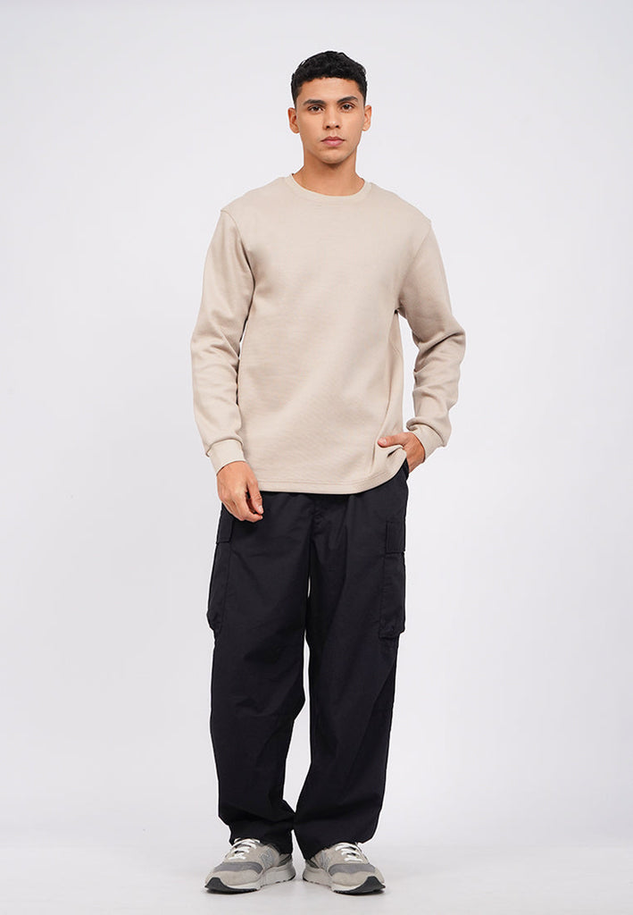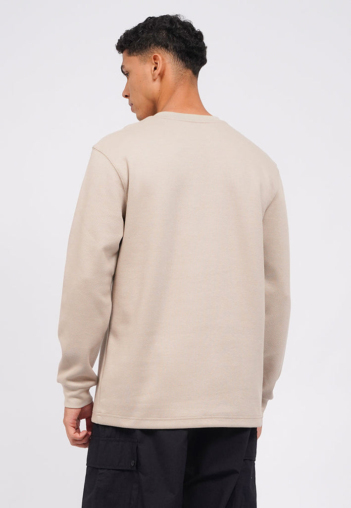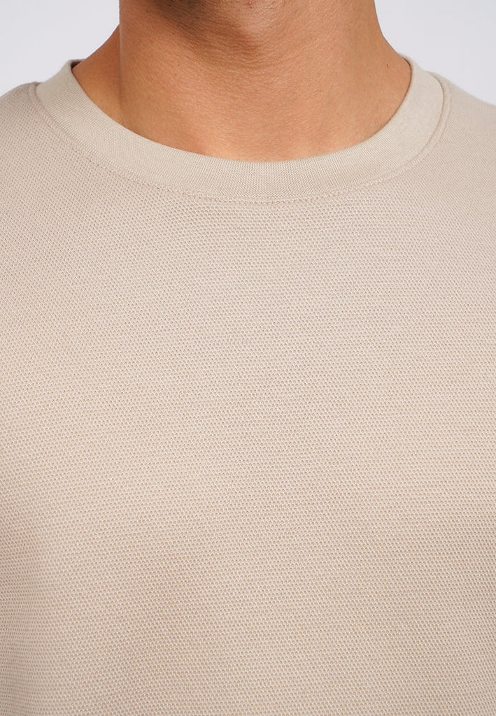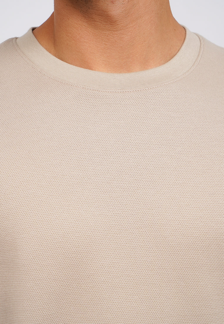 T-shirt lengan panjang, Round neck, Drop shoulder details, Textured fabric, Material: CVC Double Knit, Fit: Regular, Color: Taupe, Model info: Model Wearing Size M, Height: 182, Chest: 94, Waist: 75, Hips: 96, Art: 1-TLRCRT225K290