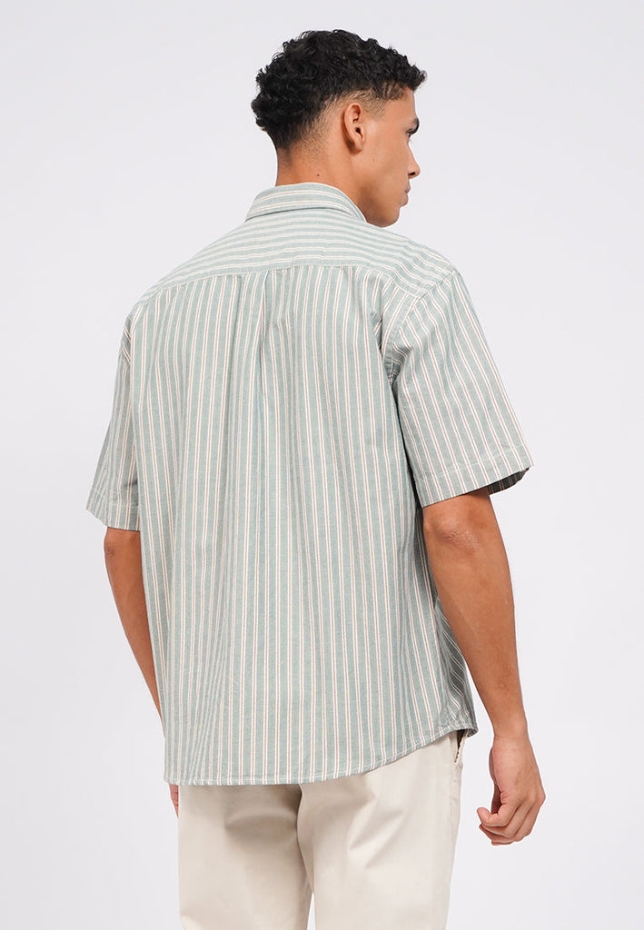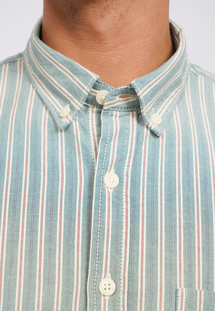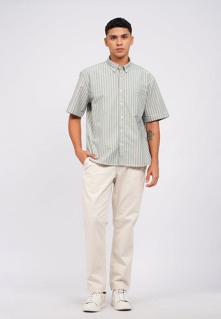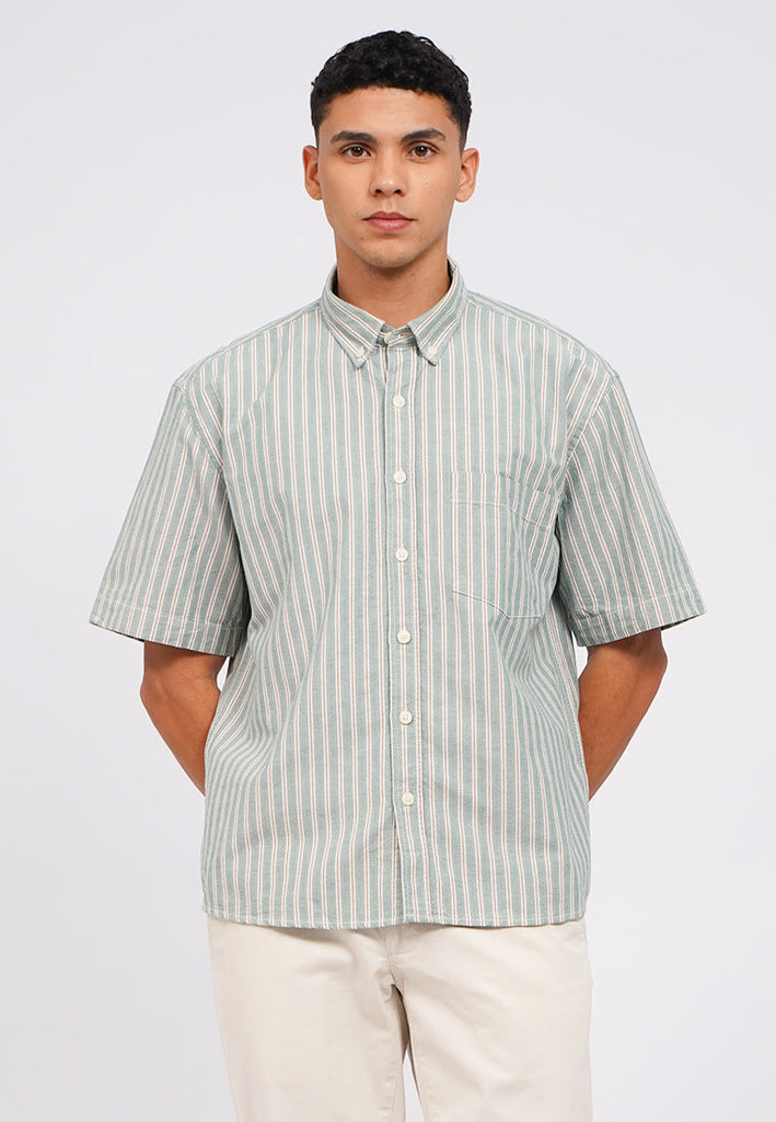 Kemeja lengan pendek, Buttoned down collar, Pointed front pocket, Stripes printed fabric, Material: Cotton, Fit: Relaxed Fit, Color: Olive, Model info: Model Wearing Size 15,5, Height: 182, Chest: 94, Waist: 75, Hips: 96, Art: 1-SSXCRT225K172