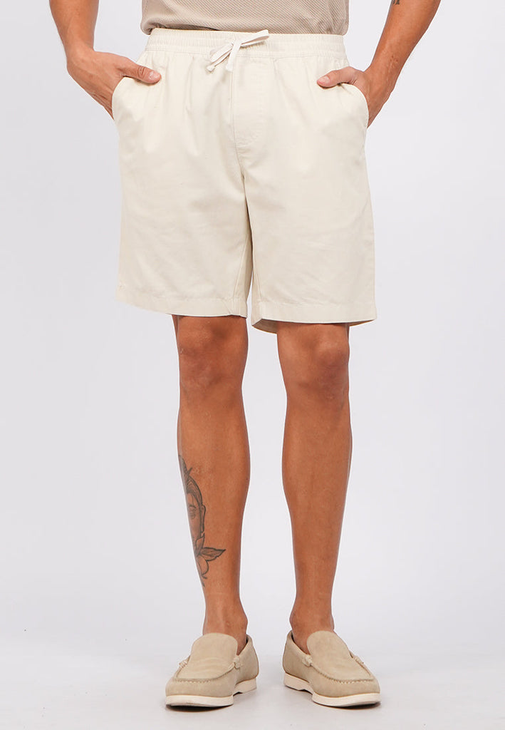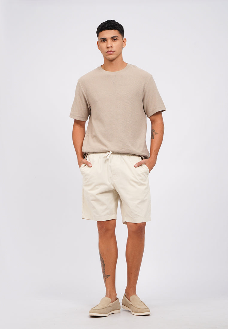 Celana pendek slim fit, Back patch pocket, Adjustable waist with drawstring, Side pocket details, Inseam 8.5", Material: Cotton, Fit: Slim, Color: Ecru, Model info: Model Wearing Size M, Height: 182, Chest: 94, Waist: 75, Hips: 96, Art: 1-SPICRT225K347