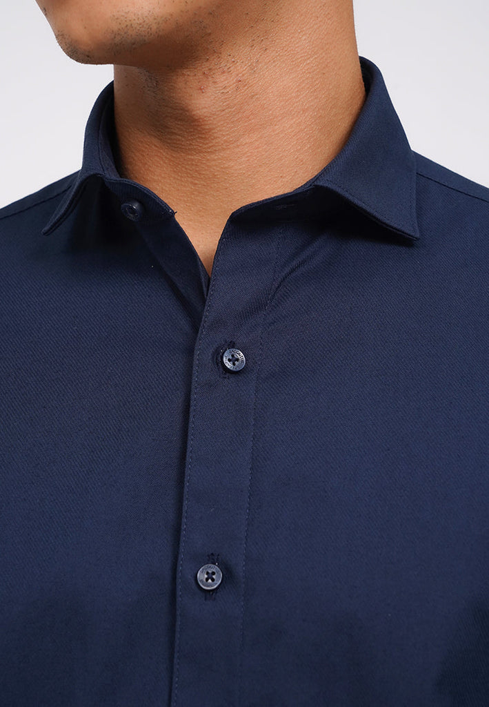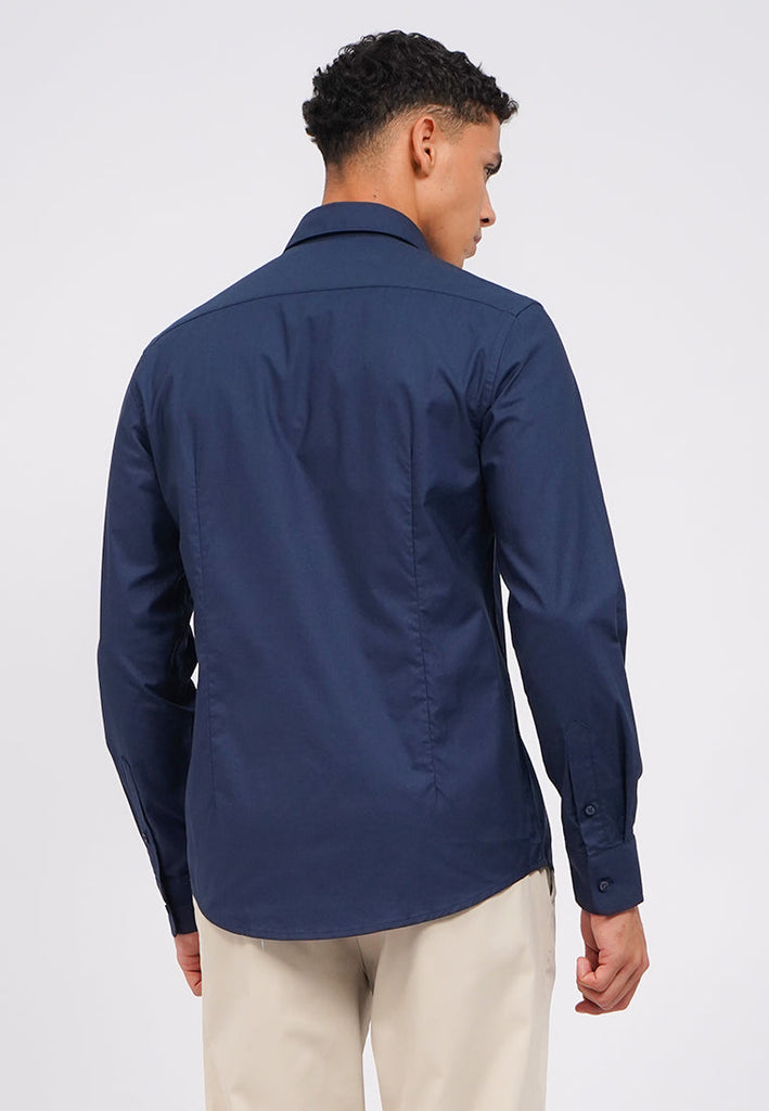 Kemeja lengan panjang, Front button opening, Curved hemline, Stretch fabric, Material: CVC Stretch, Fit: Slim, Color: Midnight Blue, Model info: Model Wearing Size 15,5, Height: 182, Chest: 94, Waist: 75, Hips: 96, Art: 1-LSICRO225K207