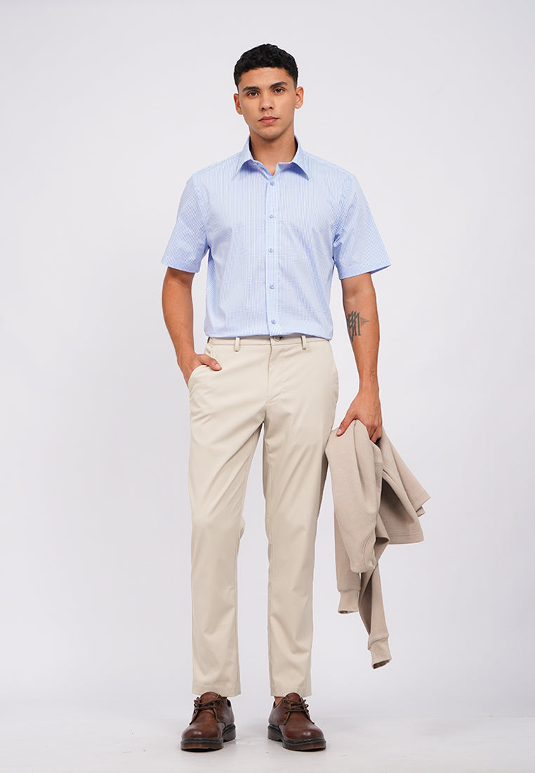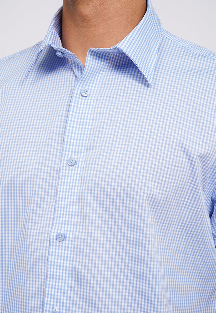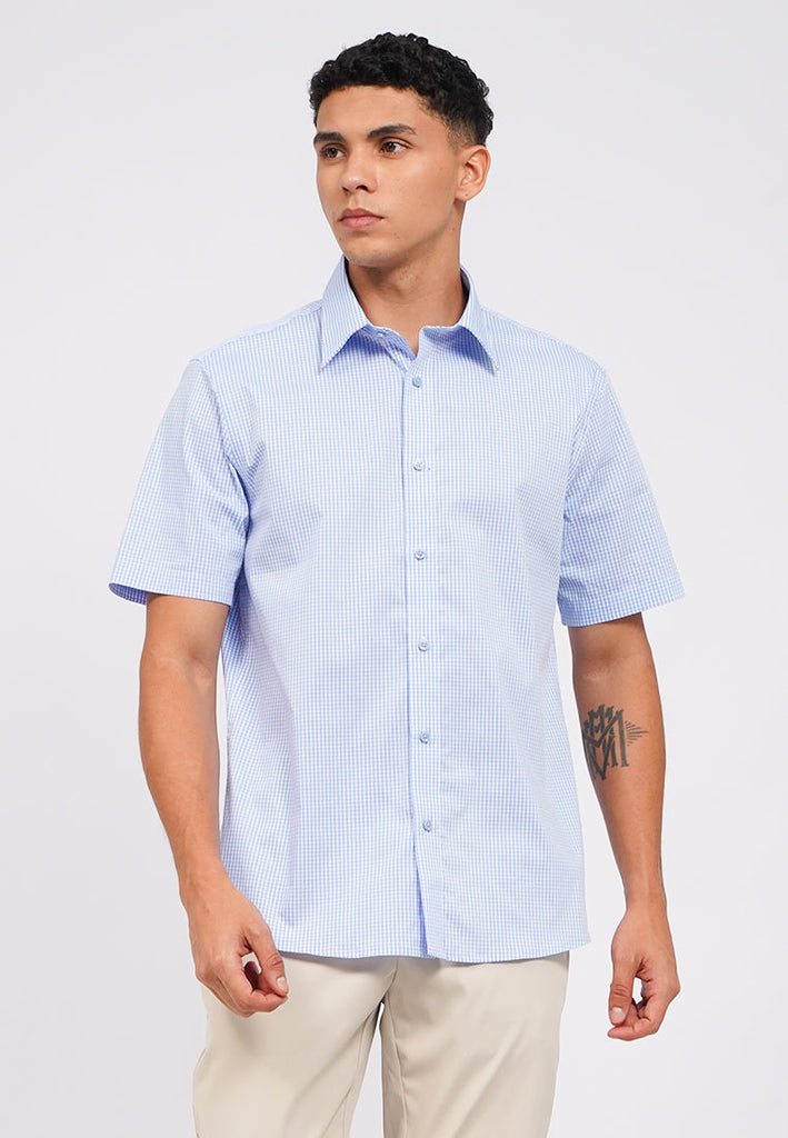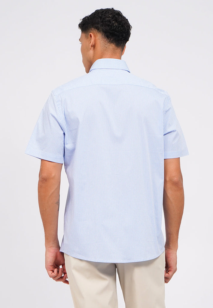 Kemeja lengan pendek, Front button opening, Checks printed fabric, Curved hemline, Material: Cotton Nylon, Fit: Slim, Color: Lt. Blue, Model info: Model Wearing Size 15,5, Height: 182, Chest: 94, Waist: 75, Hips: 96, Art: 1-SSRCRO225K221