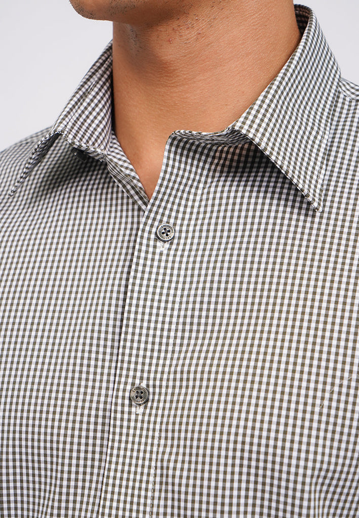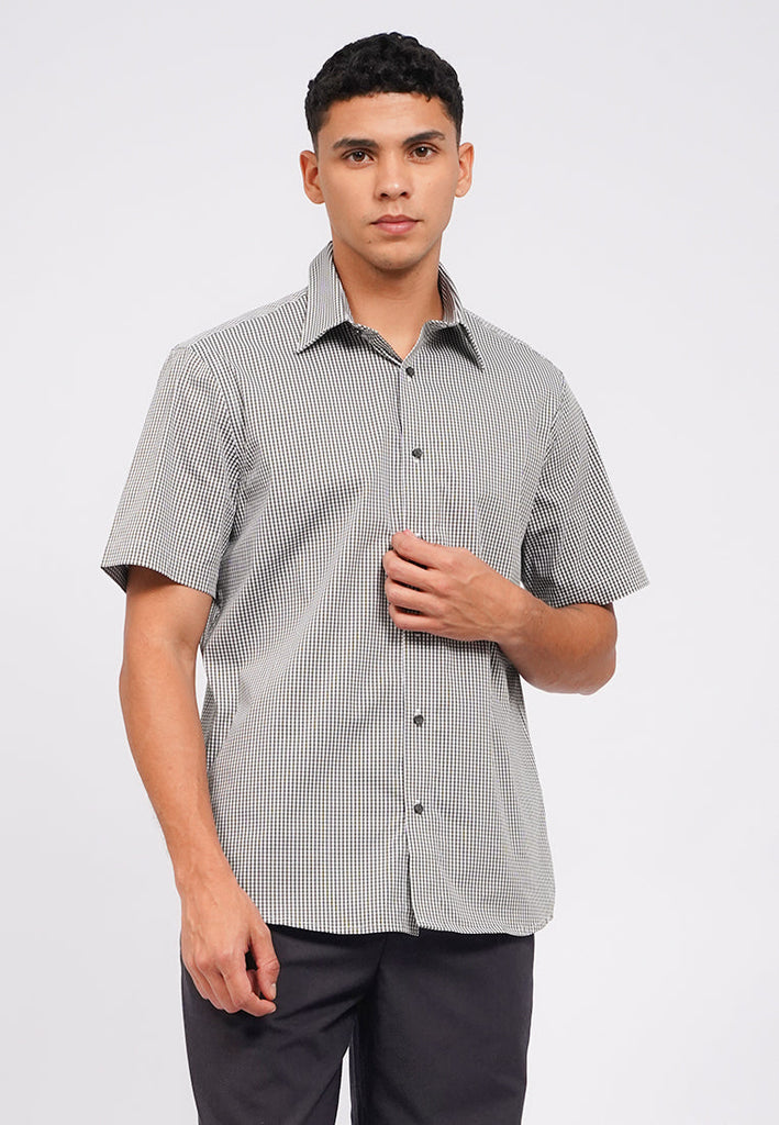 Kemeja lengan pendek, Front button opening, Checks printed fabric, Curved hemline, Material: Cotton Nylon, Fit: Regular, Color: Olive, Model info: Model Wearing Size 15,5, Height: 182, Chest: 94, Waist: 75, Hips: 96, Art: 1-SSRCRO225K222