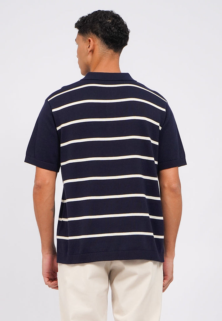 Polo shirt lengan pendek, Ribbed collar, Drop shoulder, Front button opening, Striped knit fabric, Material: Cotton, Fit: Regular, Color: Navy, Model info: Model Wearing Size M, Height: 182, Chest: 94, Waist: 75, Hips: 96, Art: 1-PSRCRT225J187