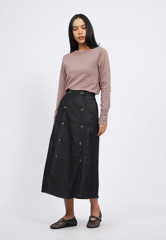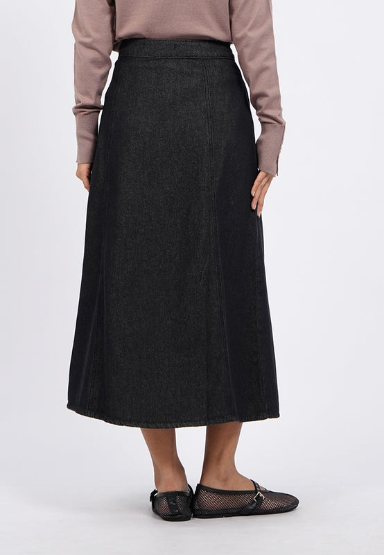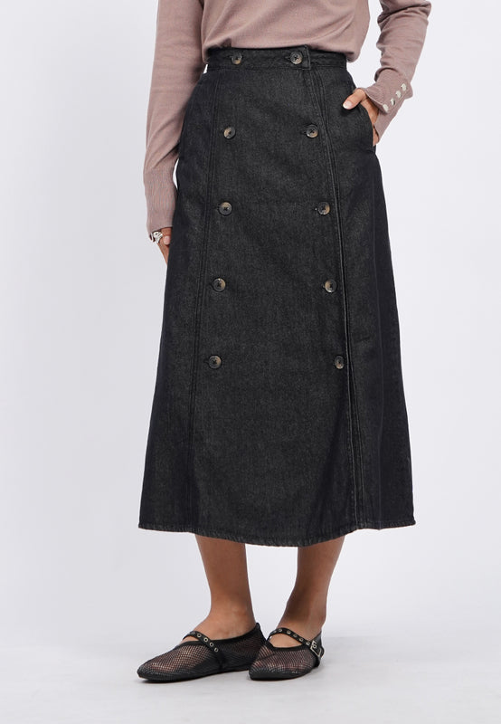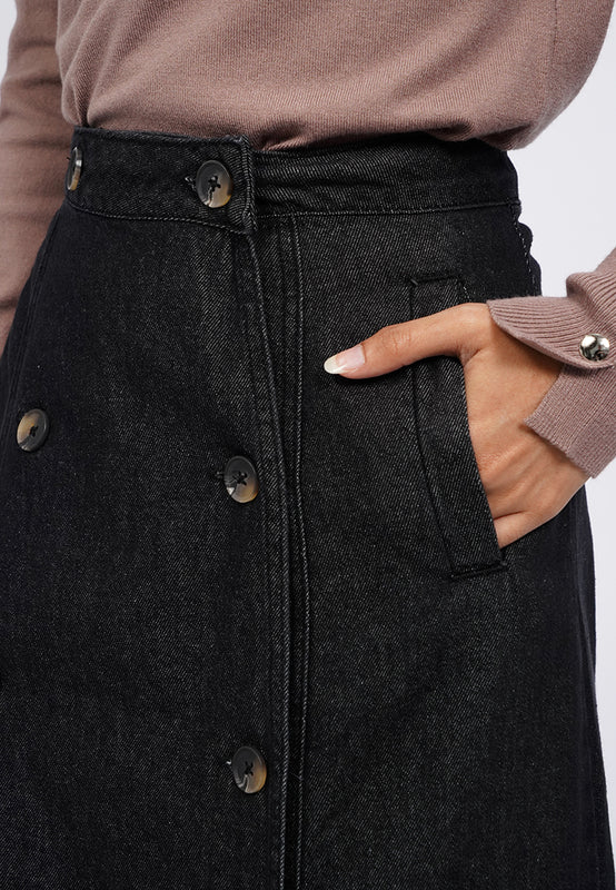 Denim midi skirt, A-line, Front wrap with contrast button, Side pocket details, Material: Denim, Fit: Regular, Color: Black, Model info: Model Wearing Size S, Height: 165 cm, Bust: 86 cm, Waist: 63 cm, Hips: 78 cm