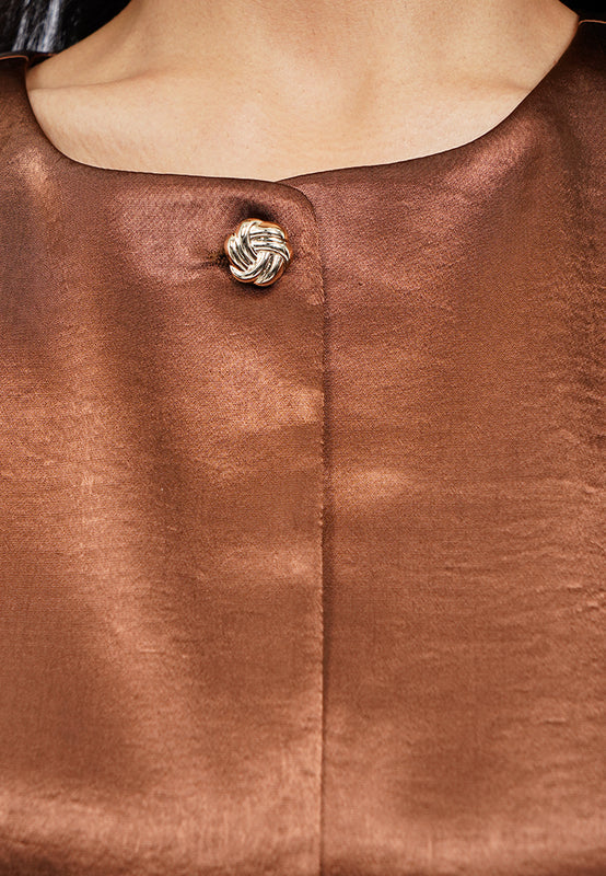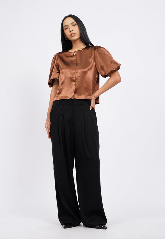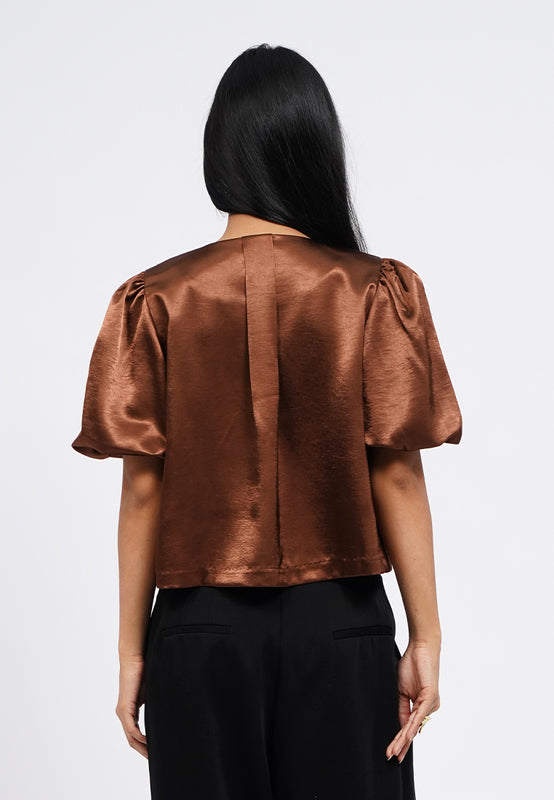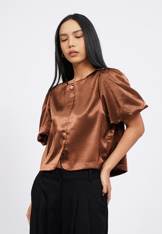 Blouse lengan pendek, Round neck, Balloon sleeves, Front button opening, Material: Polyester, Fit: Regular, Color: Brown, Model info: Model Wearing Size S, Height: 165 cm, Bust: 86 cm, Waist: 63 cm, Hips: 78 cm