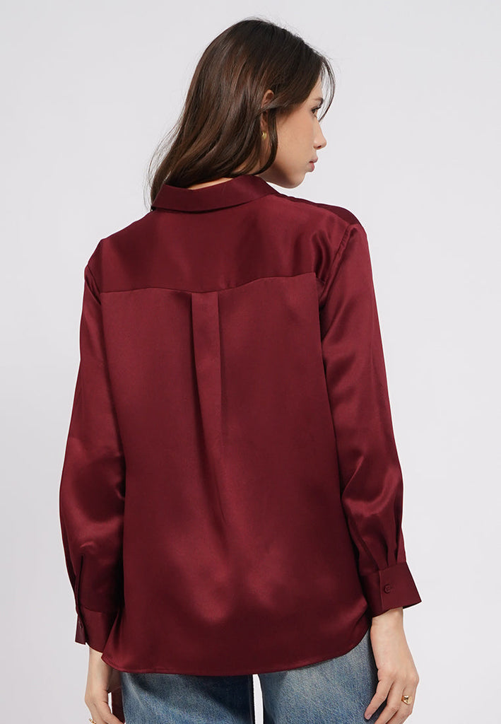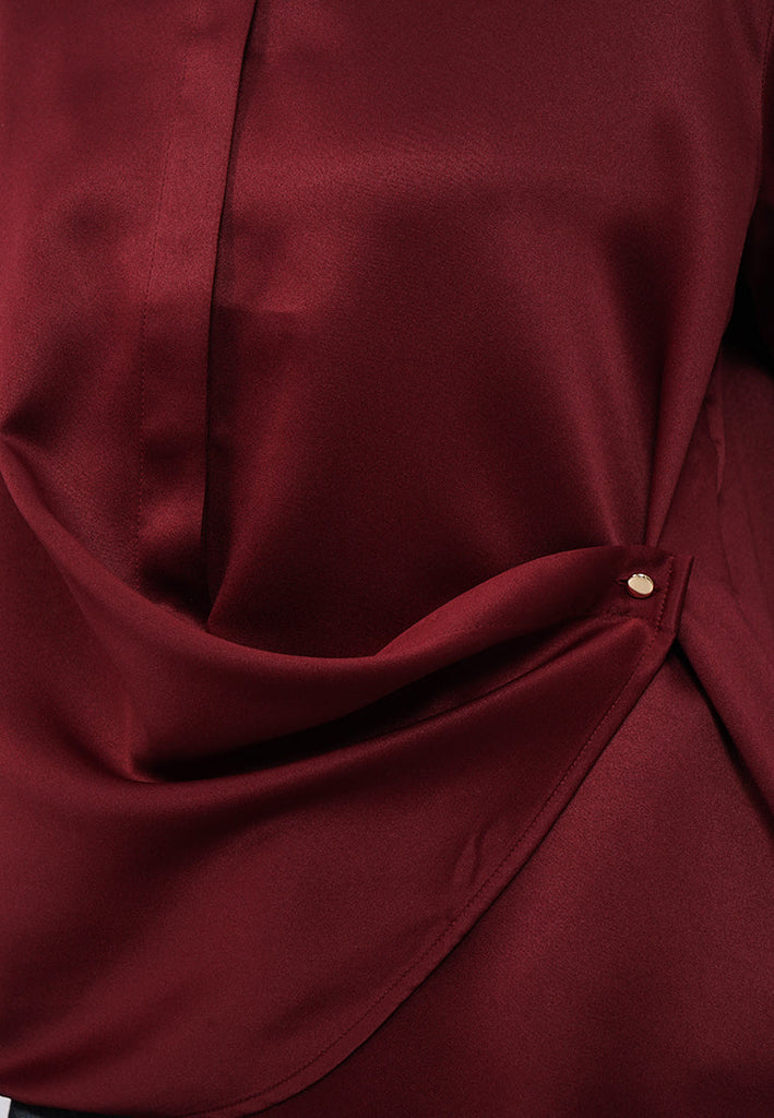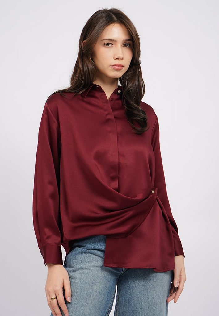 Blouse lengan panjang, Kerah kemeja, Front drape with button details, Hidden front button opening, Material: Satin, Fit: Oversized, Color: Berry, Model info: Model Wearing Size S, Height: 175cm, Bust: 89, Waist: 69, Hips: 89, Art: 5+BLWSIG225K006