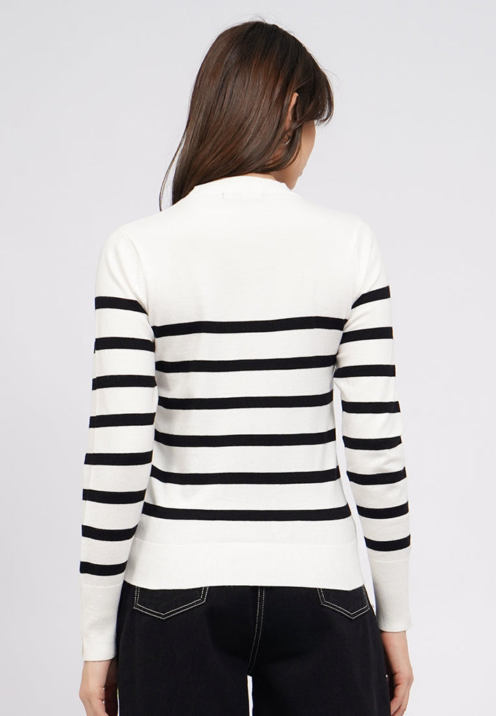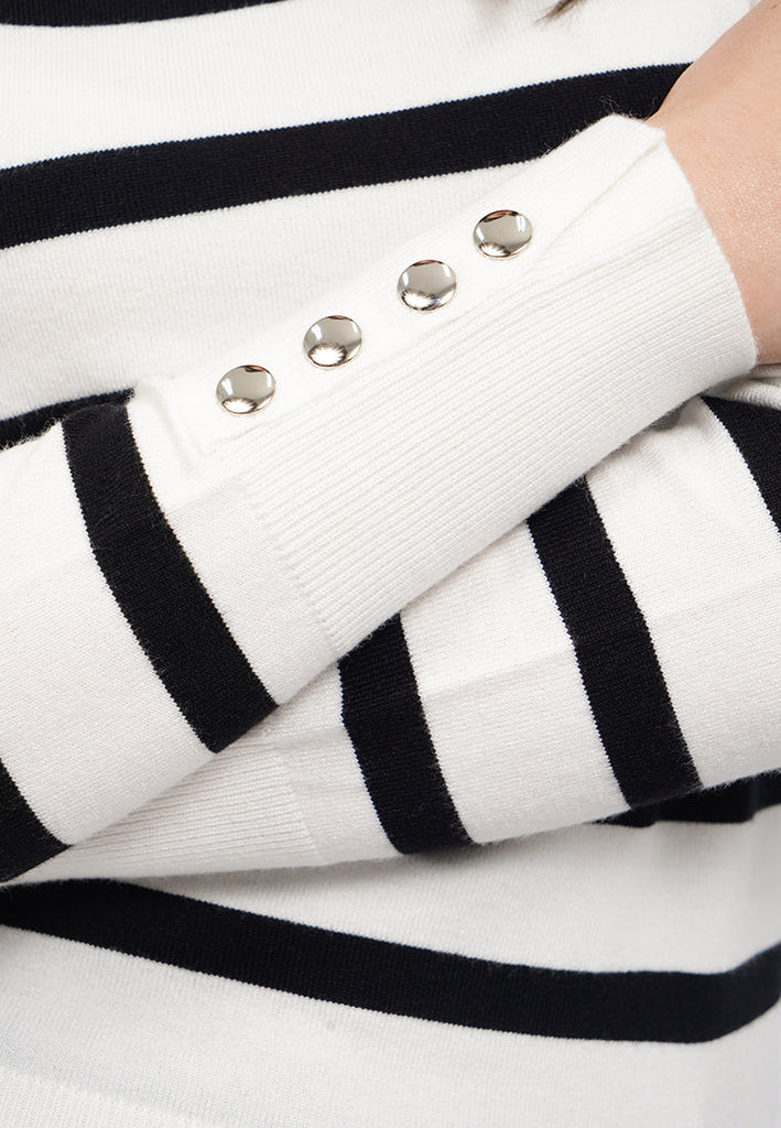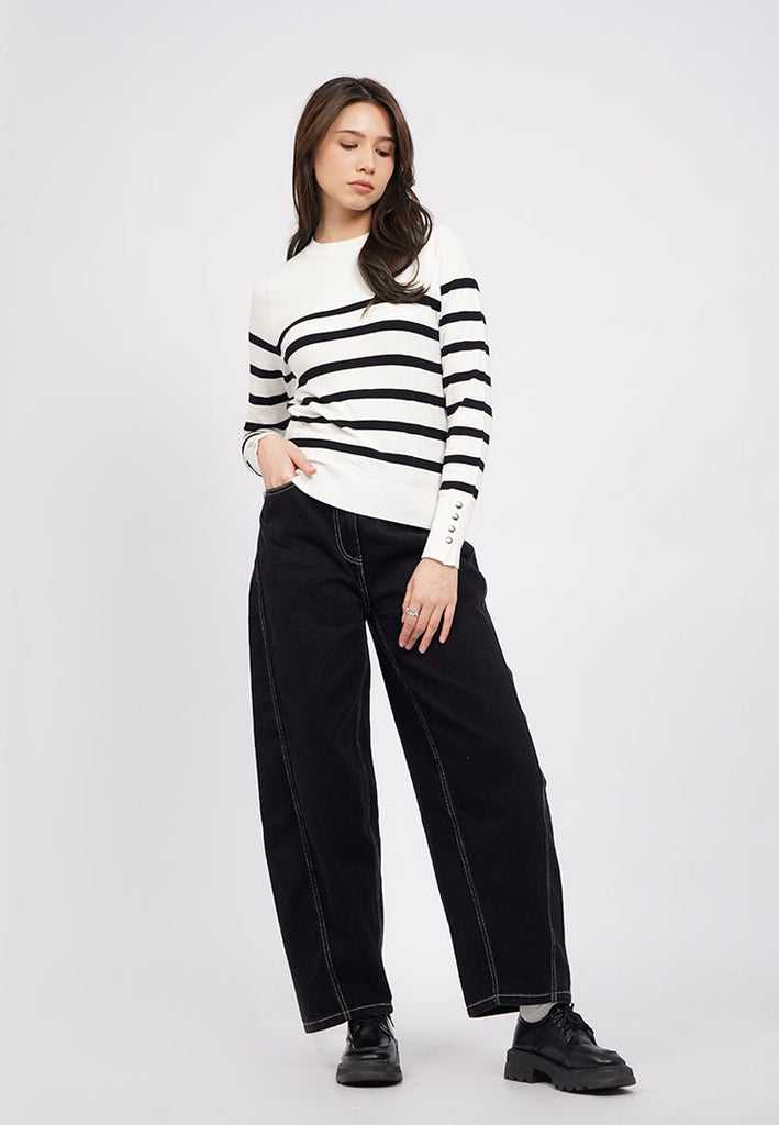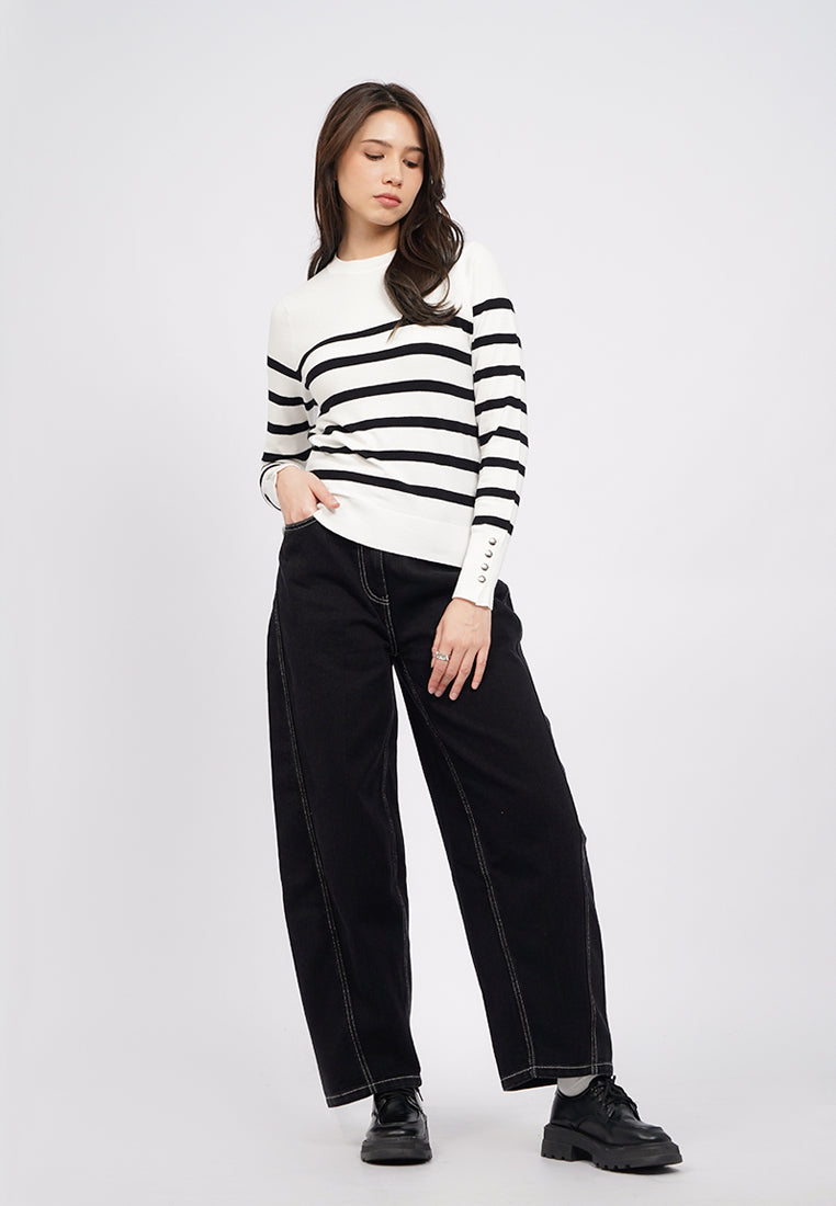 Atasan lengan panjang, Round neck, Soft touch stripes printed fabric, Contrast button on sleeve opening, Material: Soft Knit, Fit: Regular, Color: Off White, Model info: Model Wearing Size S, Height: 175cm, Bust: 89, Waist: 69, Hips: 89, Art: 5-SWGKSG225J054