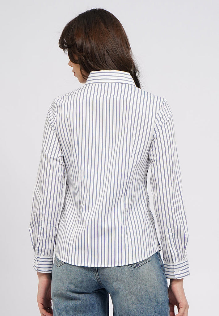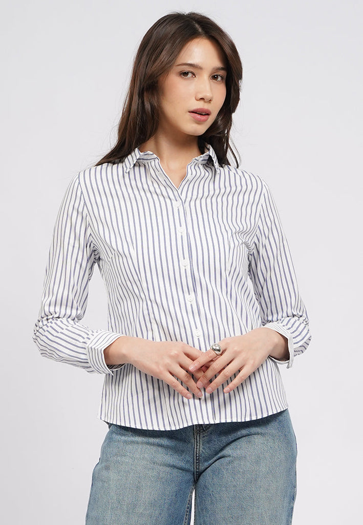 Blouse lengan panjang, Kerah kemeja, Slim cut, Stripes printed fabric, Rounded hemline, Material: Cotton, Fit: Slim, Color: White, Model info: Model Wearing Size S, Height: 175cm, Bust: 89, Waist: 69, Hips: 89, Art: 5-BLWKSG225J025