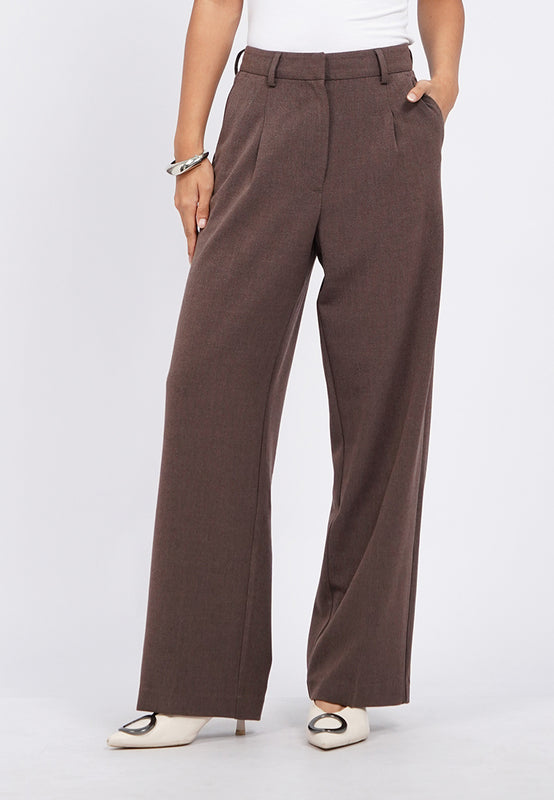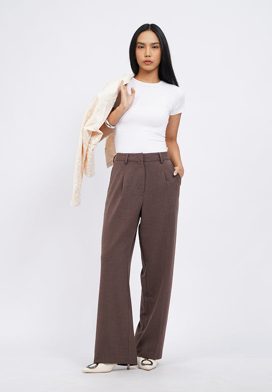 Celana panjang straight leg, Double side and back pocket, Front pleat details, Dilengkapi belt loop, Material: Poly Rayon Spandex, Fit: Straight Loose, Color: Brown, Model info: Model Wearing Size S, Height: 165 cm, Bust: 86 cm, Waist: 63 cm, Hips: 78 cm