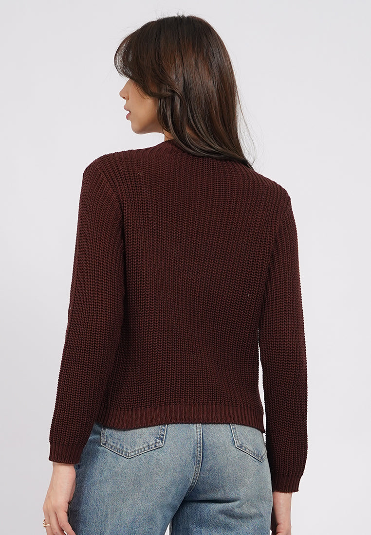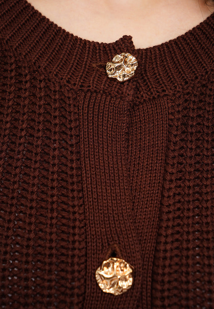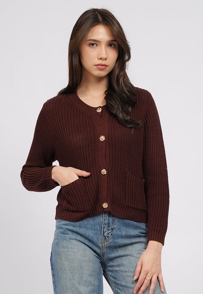 Cardigan lengan panjang, Round neck, Fancy button opening, Double front pocket, Textured fabric, Material: Cotton Acrylic, Fit: Regular, Color: Brown, Model info: Model Wearing Size S, Height: 175cm, Bust: 89, Waist: 69, Hips: 89, Art: 5-COGKSG225J051