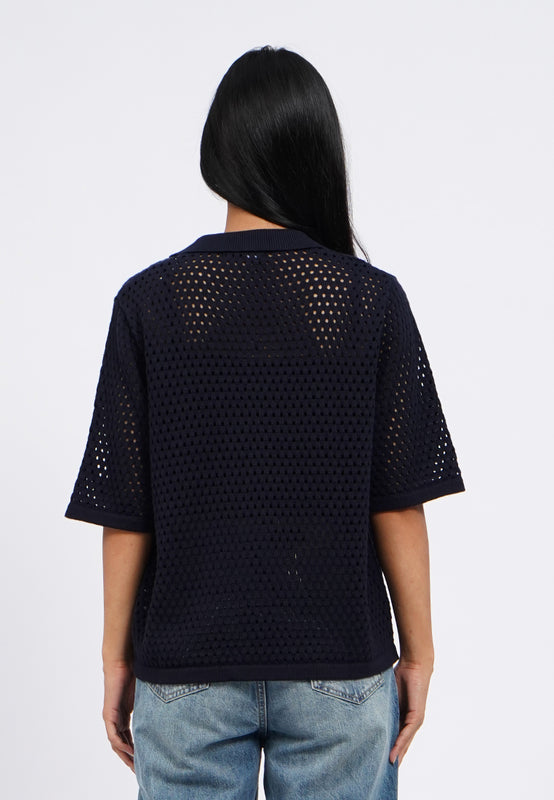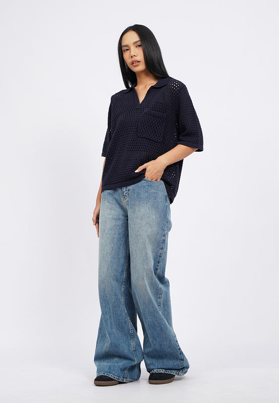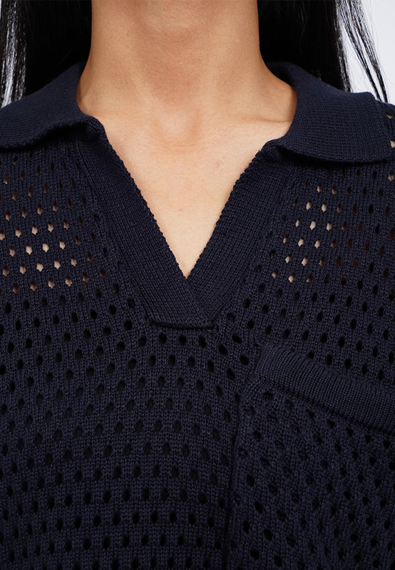 Atasan lengan pendek, V-neck with polo collar, Openwork knit fabric, Front pocket details, Material: Cotton Acrylic Knit, Fit: Regular, Color: Navy, Model info: Model Wearing Size S, Height: 165 cm, Bust: 86 cm, Waist: 63 cm, Hips: 78 cm