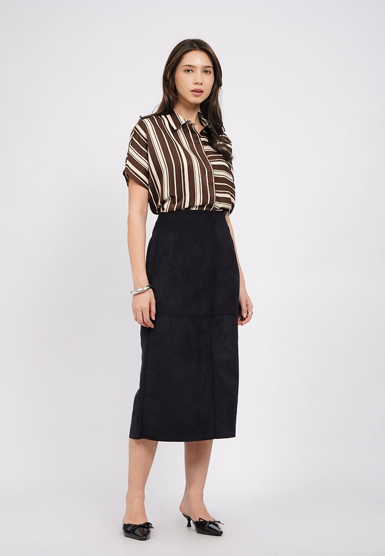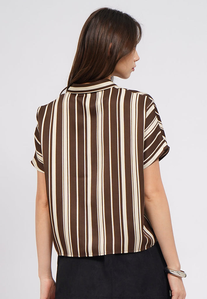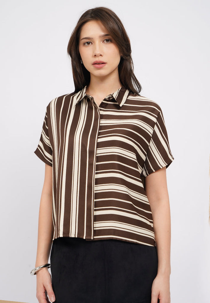 Blouse lengan pendek, Kerah kemeja, Printed silky fabric, Front button opening, Material: Polyester, Fit: Regular, Color: Brown, Model info: Model Wearing Size S, Height: 175cm, Bust: 89, Waist: 69, Hips: 89, Art: 5-BSWKSG225J045