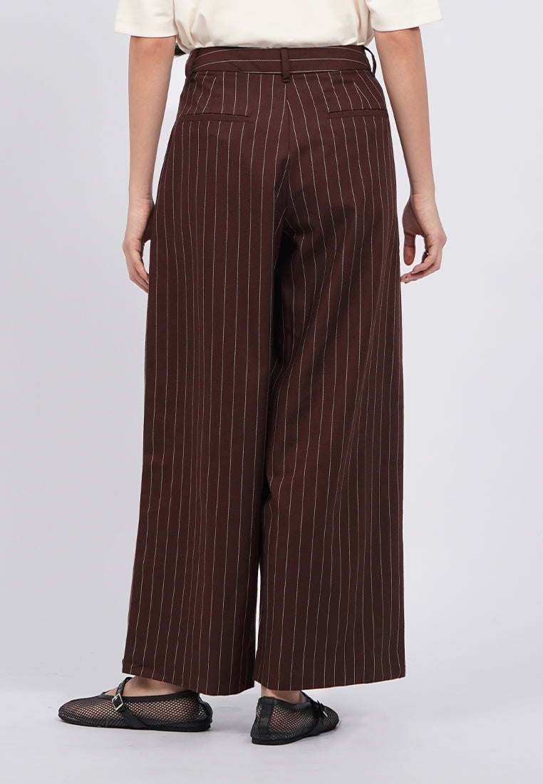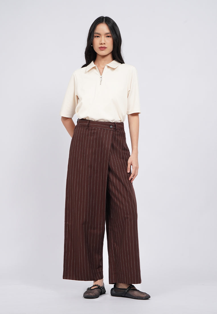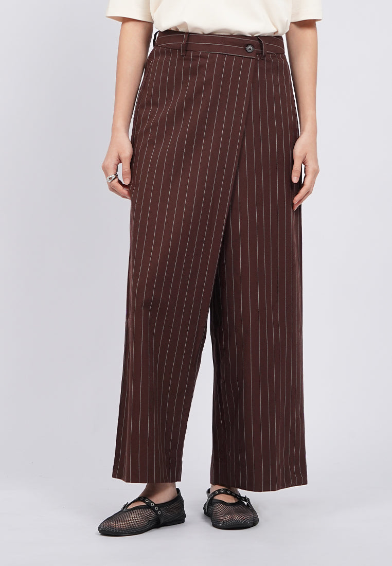 Celana panjang motif stripes, Front wrap with button details, Double back pocket, Dilengkapi belt loop, Material: Poly Cotton, Fit: Regular, Color: Dark Brown, Model info: Model Wearing Size S, Height: 168cm, Bust: 74cm, Waist: 62cm, Hips: 86cm