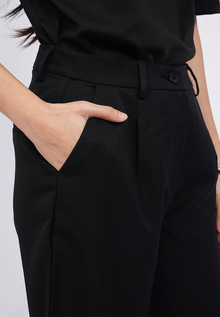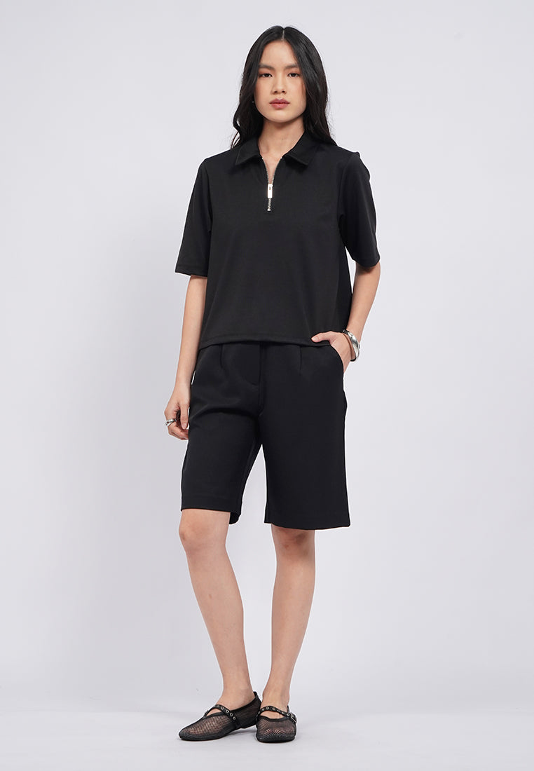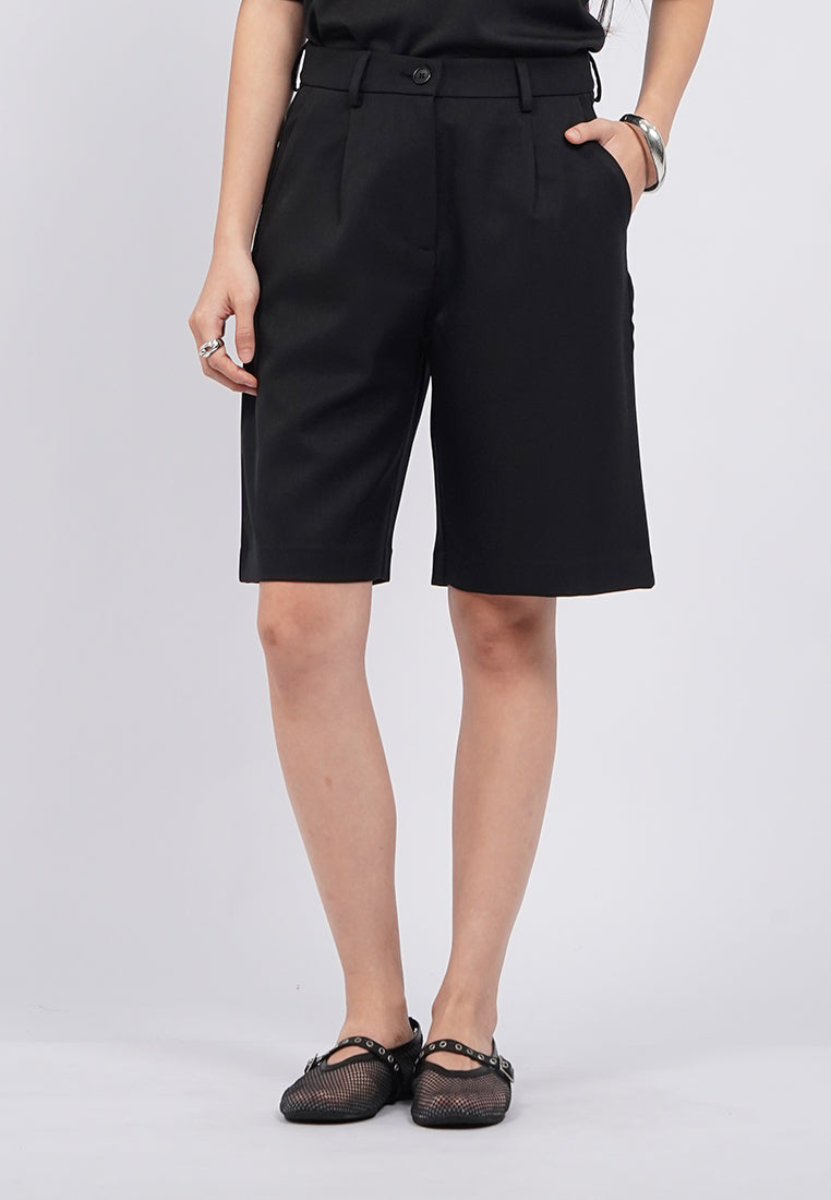 Knee length short pants, Front pleat details, Side pocket, 9 inch inseam, Front zipper with button opening, Material: Twill, Fit: Regular, Color: Black, Model info: Model Wearing Size S, Height: 168cm, Bust: 74cm, Waist: 62cm, Hips: 86cm