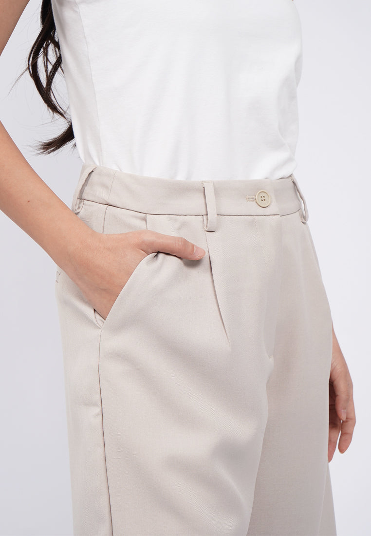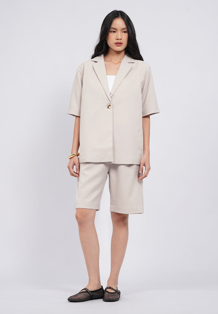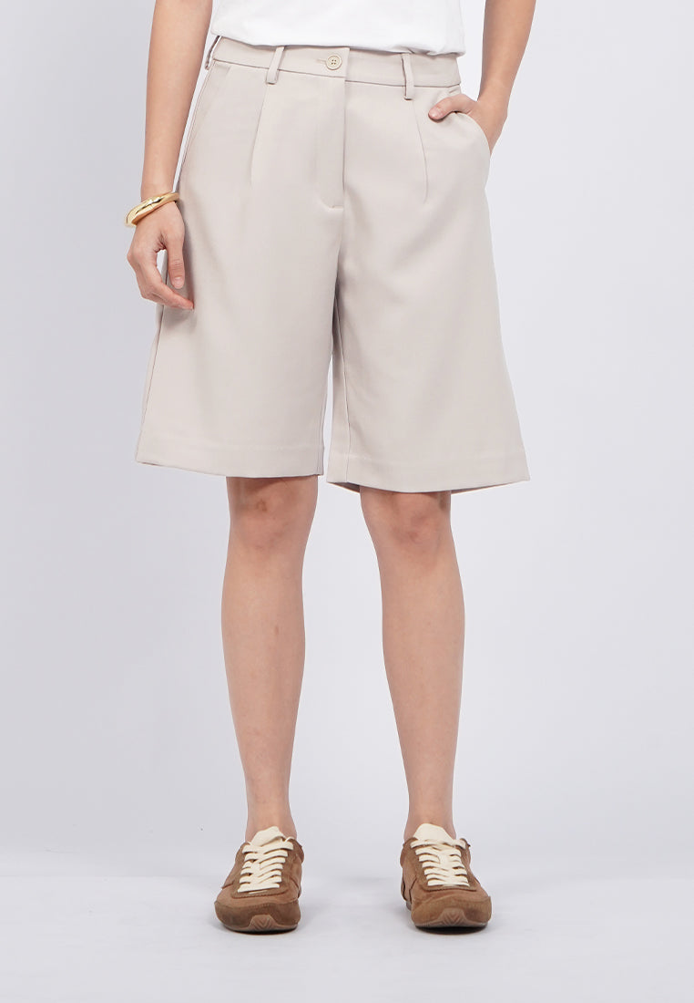 Knee length short pants, Front pleat details, Side pocket, 9 inch inseam, Front zipper with button opening, Material: Twill, Fit: Regular, Color: Beige, Model info: Model Wearing Size S, Height: 168cm, Bust: 74cm, Waist: 62cm, Hips: 86cm
